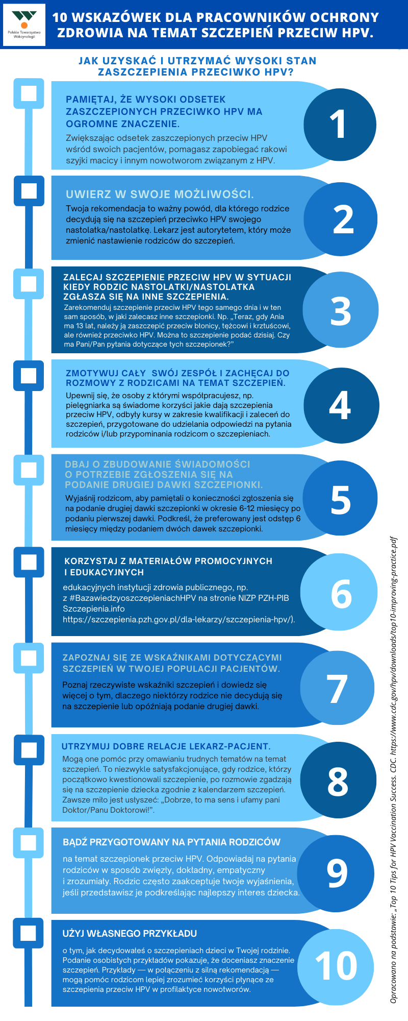 Opracowano na podstawie: „Top 10 Tips for HPV Vaccination Success„. CDC.