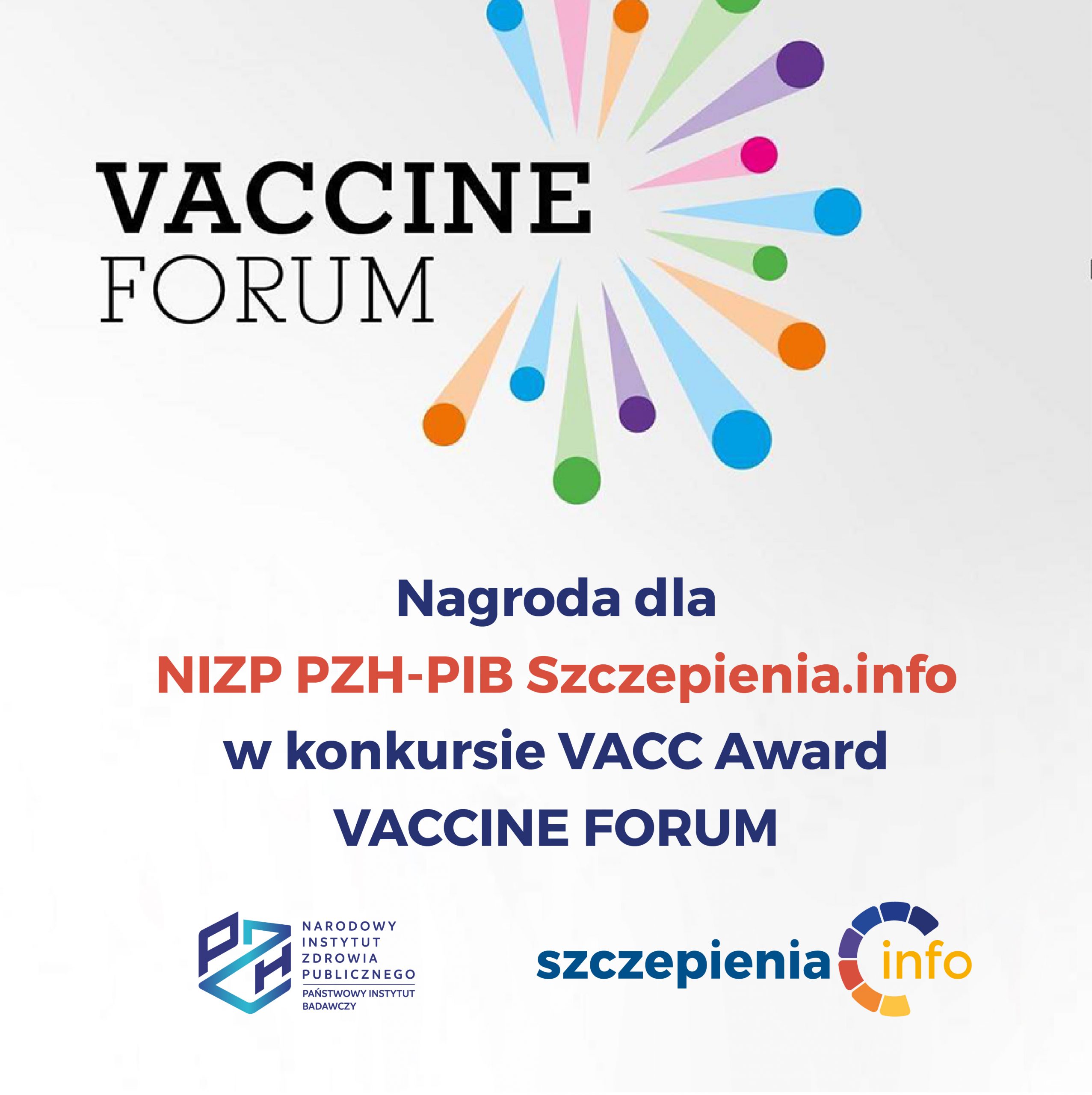 W pierwszej edycji VACCINE FORUM, która odbyła się 22.10.2021 Narodowy Instytut Zdrowia Publicznego PZH-PIB Szczepienia.info dostał nagrodę w konkursie VACC Award w kategorii Instytucja Publiczna/Organizacja Społeczna, za promowanie działalności profilaktycznej z wiarygodnym przekazem informacji na temat szczepień.