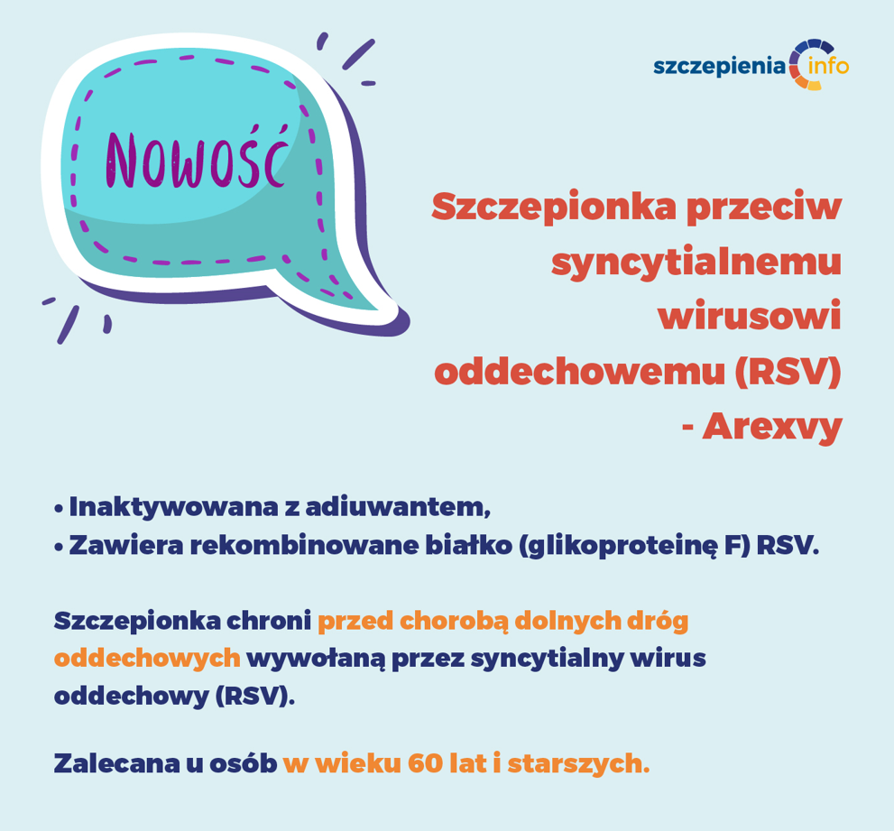 Szczepionka przeciw syncytialnemu wirusowi oddechowemu (RSV) o nazwie Arexvy jest już dostępna na rynku aptecznym. Właśnie zwolniono do obrotu pierwszą serię szczepionki na polski rynek. Preparat będzie mógł być stosowany przed sezonem wzmożonych zachorowań spowodowanych zakażeniem RSV 2023/2024, który zwykle rozpoczyna się jesienią. Szczepionka jest wskazana do profilaktyki u osób starszych w wieku 60 lat i starszych w zapobieganiu chorobie dolnych dróg oddechowych wywołanej przez syncytialny wirus oddechowy (RSV).