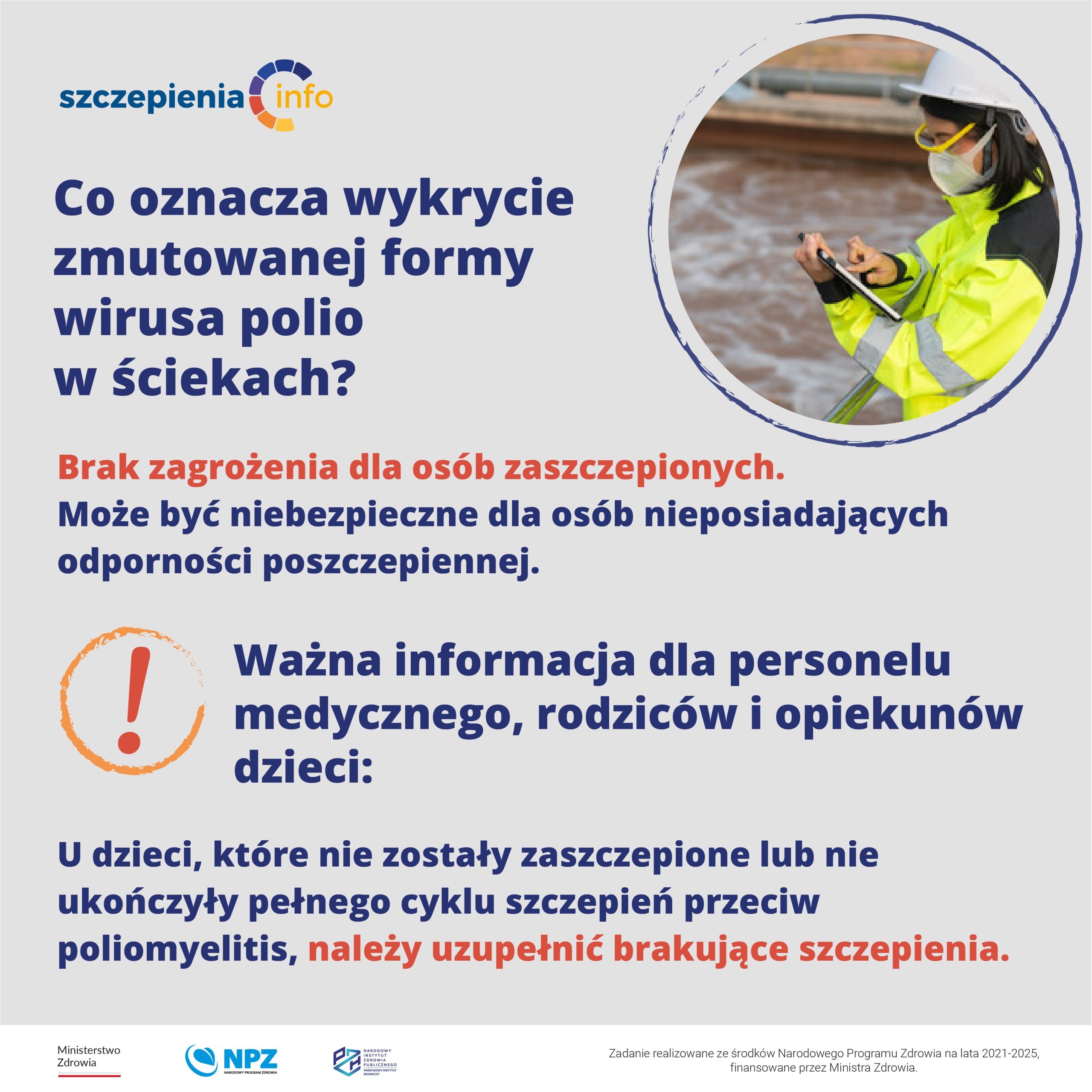 W listopadzie 2024 r. w próbce ścieków komunalnych pobranej w Warszawie wykryto obecność wirusa polio typu 2. Sytuacja taka nie stanowi zagrożenia dla osób zaszczepionych, ale może być niebezpieczna dla osób nieposiadających odporności poszczepiennej.