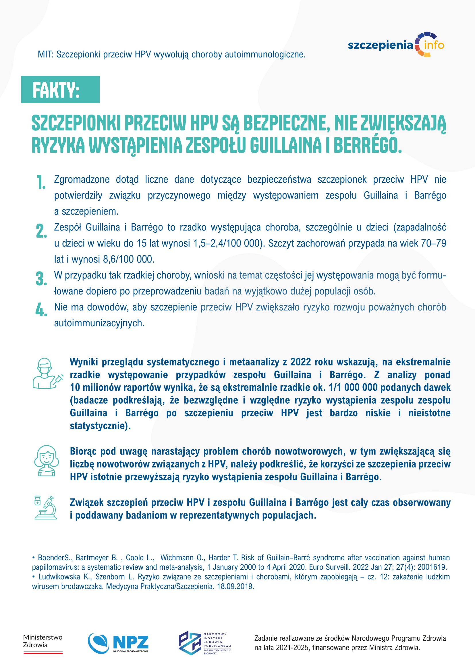 Biorąc pod uwagę narastający problem chorób nowotworowych, w tym zwiększającą się liczbę nowotworów związanych z HPV, jednoznacznie należy stwierdzić, że korzyści ze szczepienia przeciw HPV istotnie przewyższają ryzyko wystąpienia zespołu Guillaina i Barrégo.