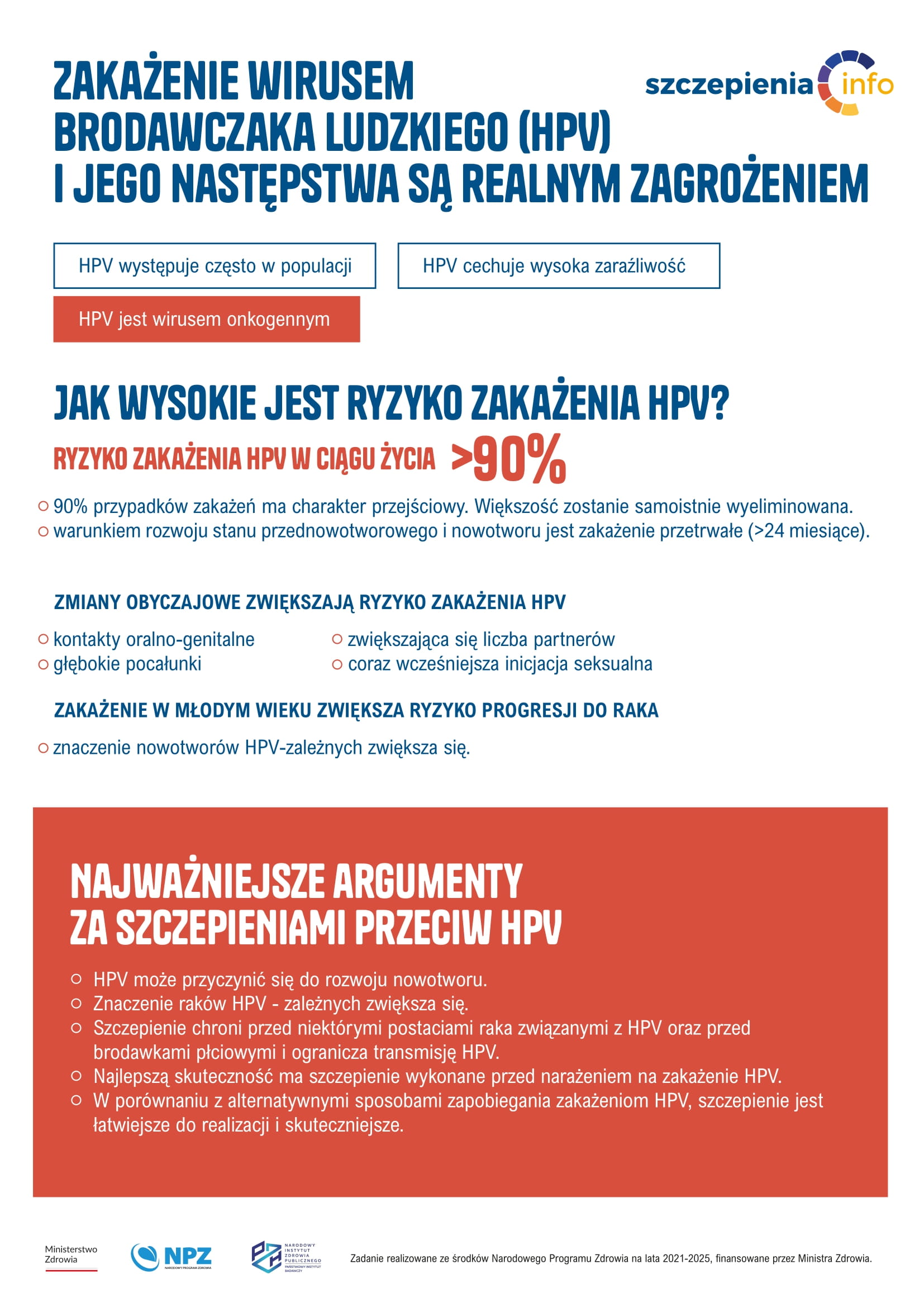 Znamy dowody na związek zakażenia typami onkogennymi HPV z rakiem szyjki macicy, jak również rakiem sromu i pochwy u kobiet, rakiem prącia u mężczyzn a także rakiem odbytu oraz nowotworami głowy i szyi (w tym rakiem krtani) u obu płci.