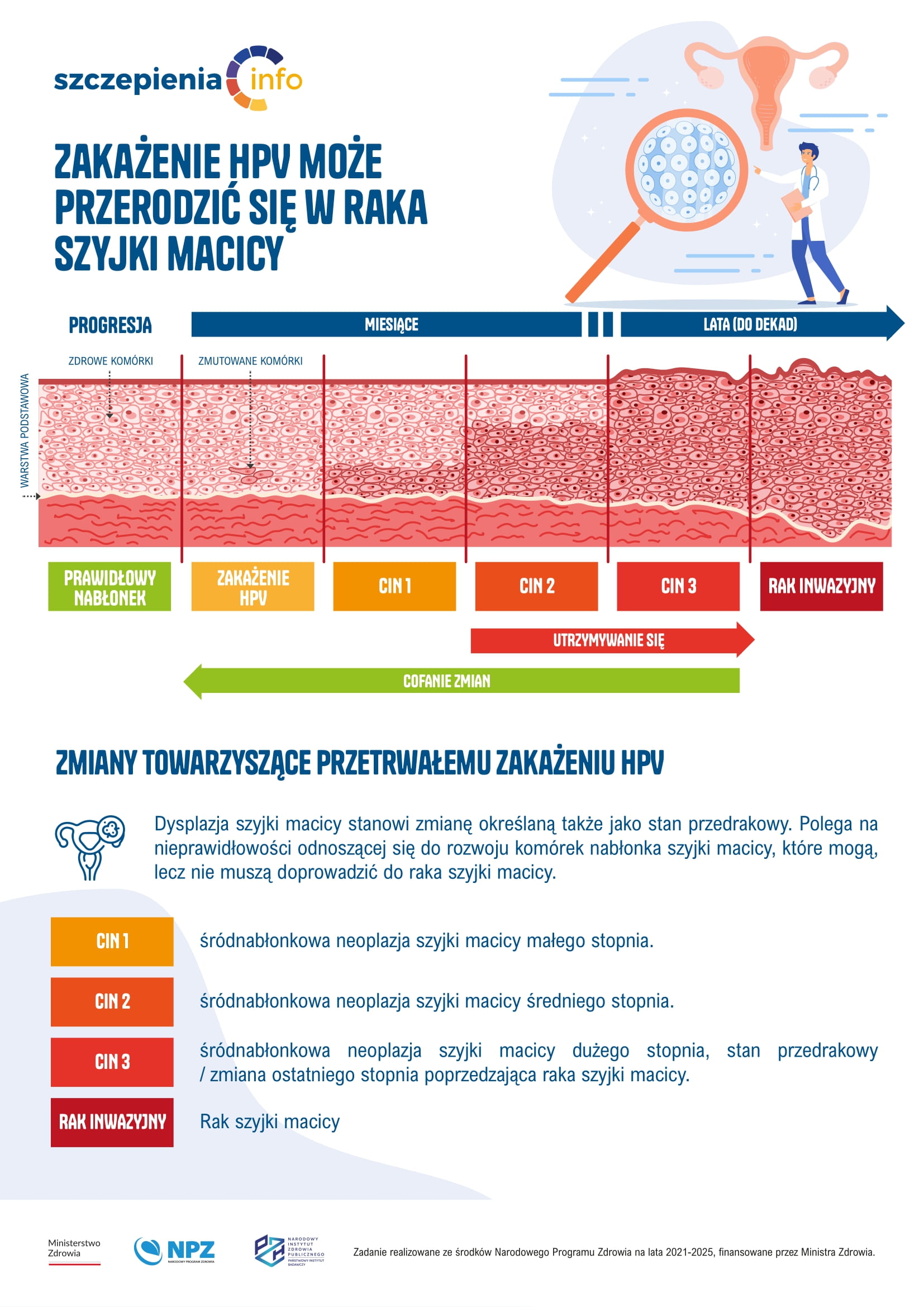 Zakażenie wirusem HPV może przejść po latach w raka szyjki macicy. Okres dzielący pierwotne zakażenie od stwierdzenia inwazyjnej postaci raka może wahać się od 5 do 40 lat.