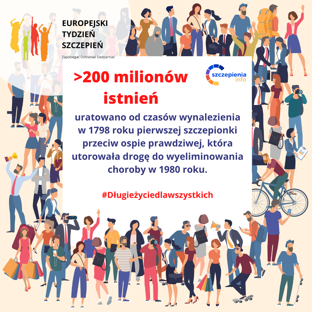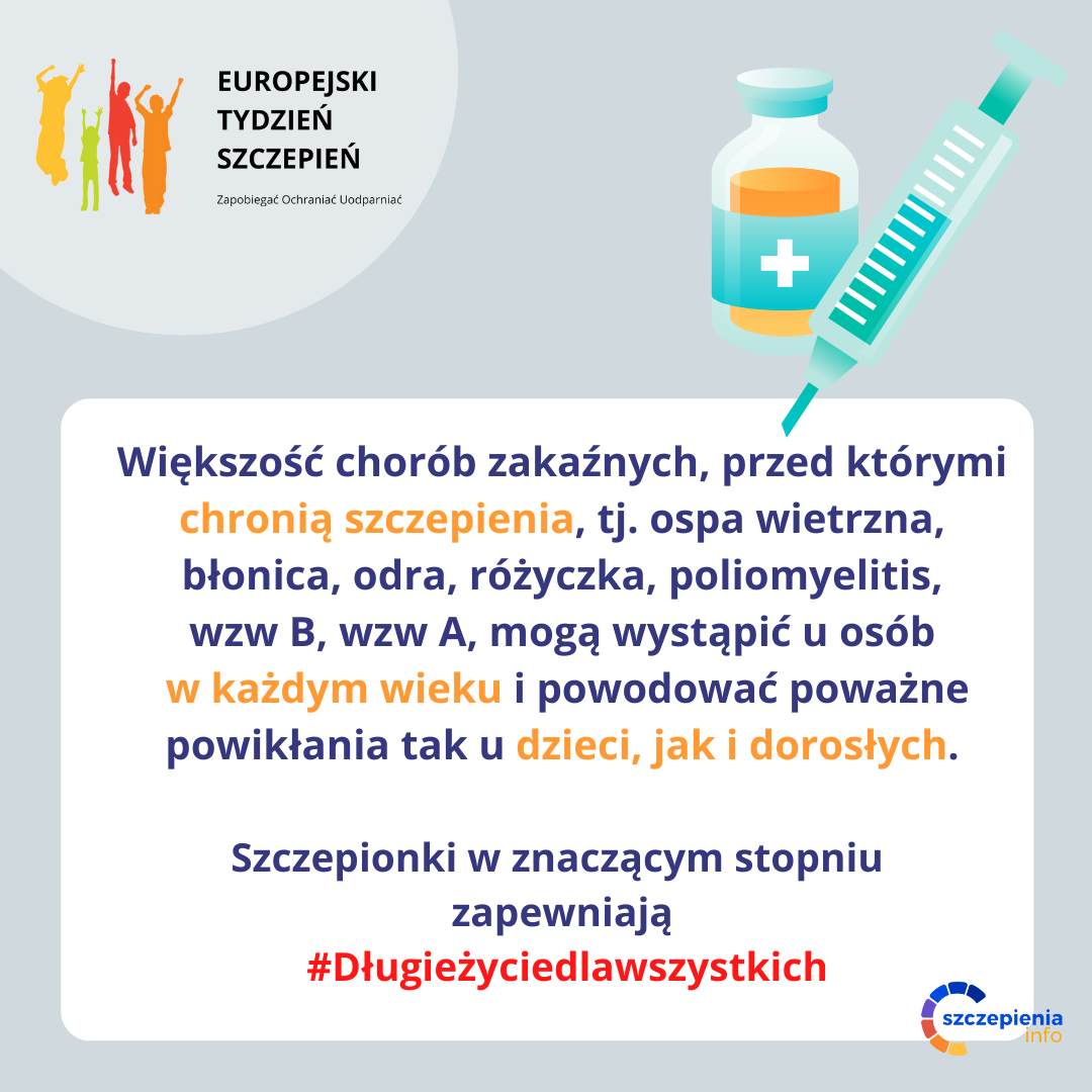 W dniach 24-30 kwietnia obchodzimy Europejski Tydzień Szczepień. Od ponad dwóch stuleci szczepionki pomagają uczynić świat bezpieczniejszym, począwszy od pierwszej szczepionki przeciw ospie prawdziwej po najnowsze szczepionki mRNA przeciw COVID-19. Hasło przewodnie tegorocznej edycji wydarzenia to „Długie życie dla wszystkich”. Celem jest podkreślenie znaczenia równego dostępu do szczepionek i szczepień, co w efekcie przyczyni się do długiego i zdrowego życia. W tym roku inicjatywa zrzesza partnerów i współpracowników Europejskiego Regionu WHO, po to by podkreślić znaczenie szczepień w ochronie osób w każdym wieku i o różnym pochodzeniu przed chorobami, którym można zapobiegać poprzez szczepienia. Dodatkowo inicjatywa ta ma na celu przypomnienie również o historycznym wpływie szczepionek na ograniczenie chorób zakaźnych i ich występowanie.