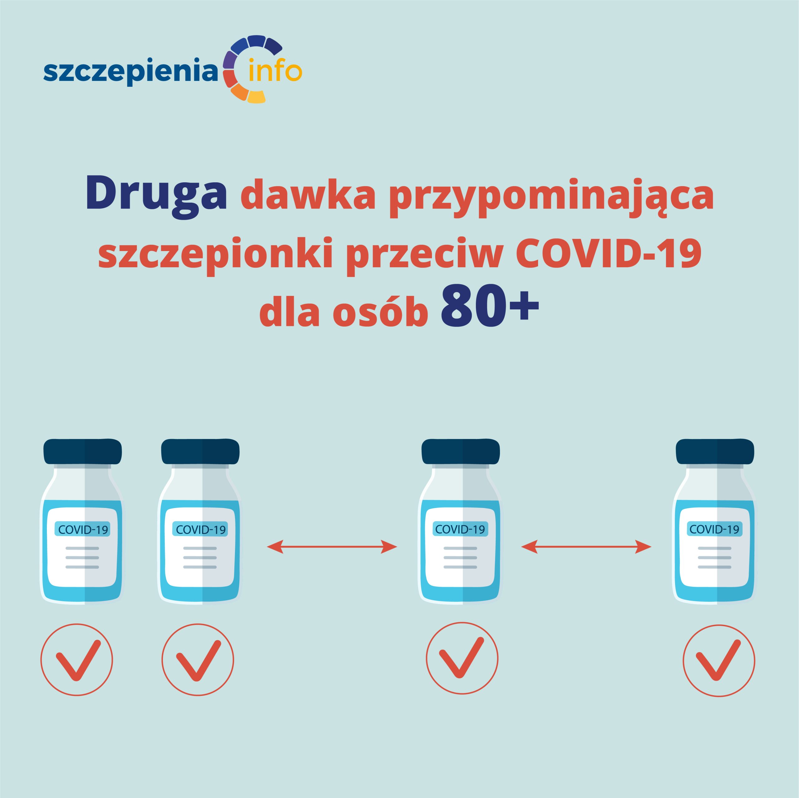 Od 20 kwietnia 2022 r. osoby, które ukończyły 80 lat i otrzymały pełny schemat szczepienia podstawowego oraz pierwszą dawkę przypominającą preparatem mRNA przeciw COVID-19, mogą przyjąć drugą dawkę przypominającą szczepionki przeciw COVID-19.