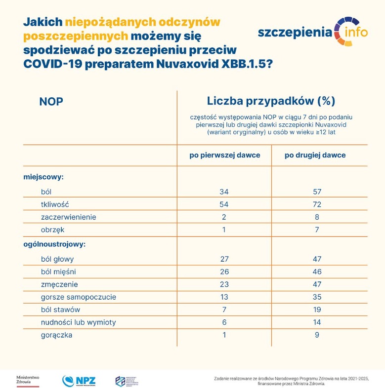 - badań klinicznych, na podstawie których oryginalna szczepionka Nuvaxovid została dopuszczona do obrotu. Znamy wyniki 2 badań z randomizacją prowadzonych w Stanach Zjednoczonych i Meksyku, w których uczestniczyło 29 949 uczestników w wieku ≥18 lat i 1799 uczestników w wieku 12–17 lat oraz wyniki badań prowadzonych w Wielkiej Brytanii w których uczestniczyło 15 187 uczestników w wieku w wieku ≥18 lat. Odnotowano typowe miejscowe i ogólnoustrojowe niepożądane odczyny poszczepienne (NOP), które występowały nieco częściej po drugiej dawce szczepionki niż po pierwszej oraz częściej w młodszych grupach wiekowych niż u starszych dorosłych. Większość NOP miała łagodne lub umiarkowane nasilenie, ustępowała w ciągu maksymalnie 2 dni. Miejscowe lub ogólnoustrojowe NOP o większym nasileniu utrudniającym codzienną aktywność lub wymagające podania leków (np. przeciwbólowych) zgłaszano rzadko, częściej po podaniu drugiej dawki niż pierwszej. Nie odnotowano niepokojących sygnałów dotyczących bezpieczeństwa szczepionki Nuvaxovid – w okresie do 7,5 miesiąca obserwacji.