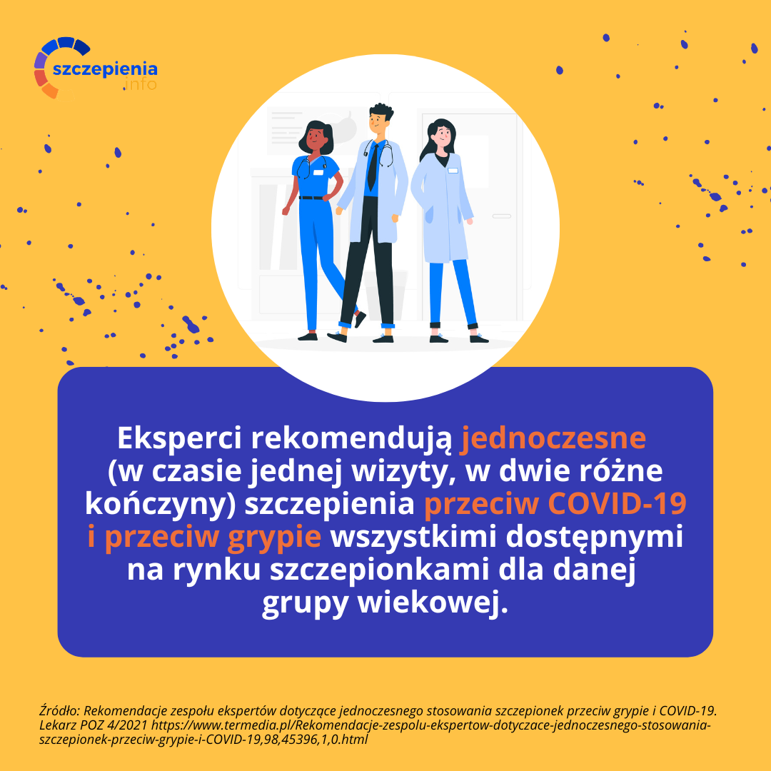 Eksperci rekomendują jednoczesne (w czasie jednej wizyty, w dwie różne kończyny) szczepienia przeciw COVID-19 i przeciw grypie wszystkimi dostępnymi na rynku szczepionkami dla danej grupy wiekowej.