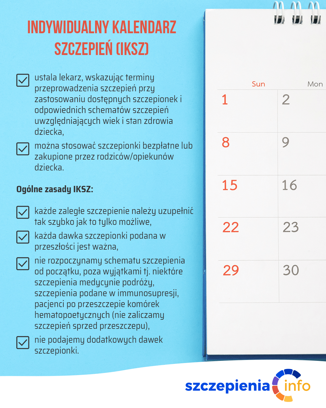Indywidualny kalendarz szczepień (IKSz) jest programem szczepień ochronnych ustalanym przez lekarza dla pacjenta (dziecka), w sytuacji kiedy doszło do zaburzenia realizacji obowiązującego kalendarza szczepień podanego w Programie Szczepień Ochronnych (PSO). Powody zaburzonego kalendarza szczepień i opóźnień w jego realizacji mogą być różne, tj. brak szczepień w związku z brakiem zgody rodziców/opiekunów dziecka, brak dokumentacji dotyczącej szczepień, opóźnienia w realizacji szczepień ze względu na stan zdrowia pacjenta, rodzina na stałe osiedla się lub wraca do Polski z innego kraju gdzie obowiązywał inny kalendarz szczepień, rodzice decydują się na rozszerzenie ochrony dziecka za pomocą dodatkowych szczepień zalecanych.