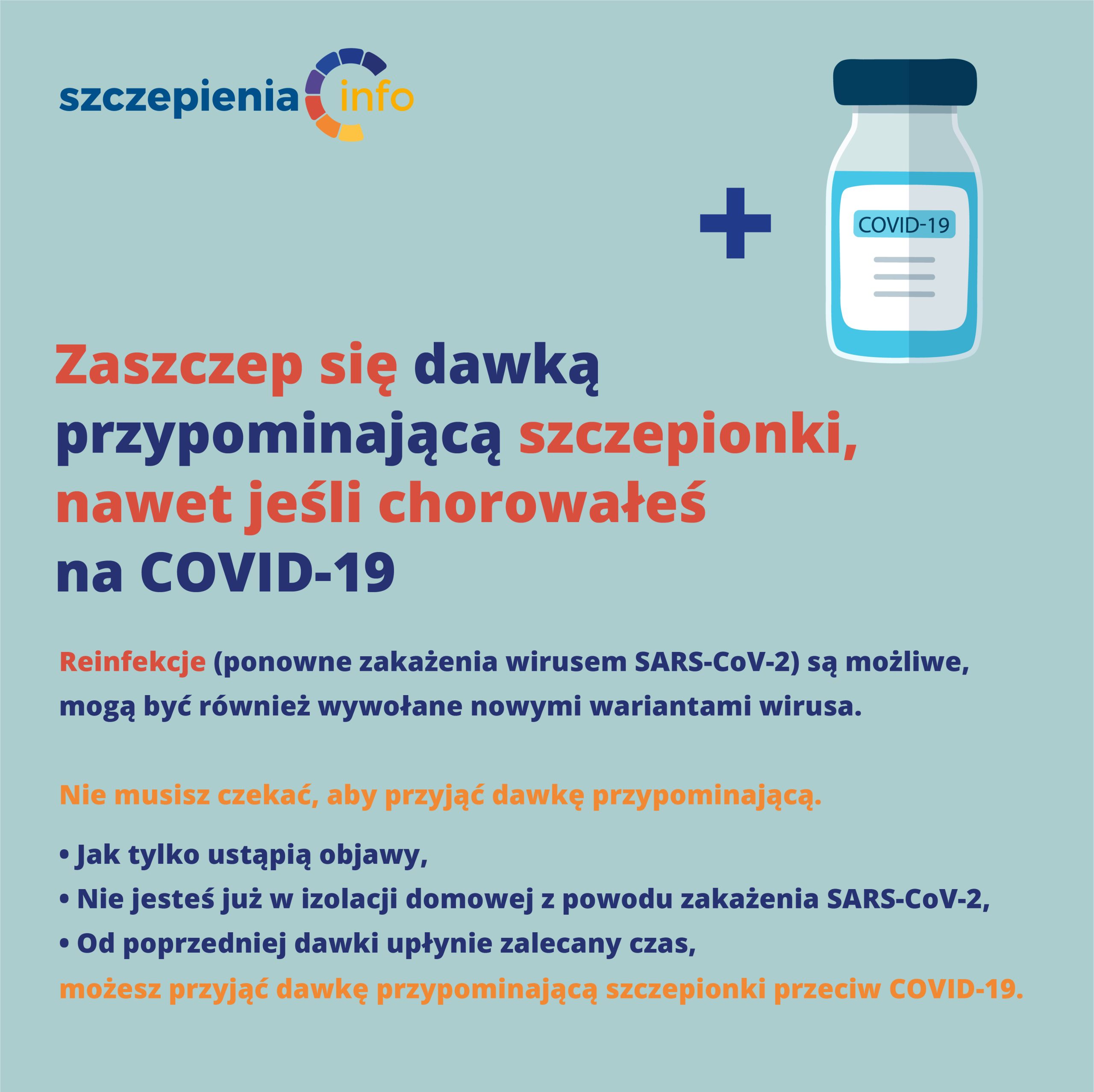 Reinfekcje są możliwe. Ponowne zachorowania na COVID-19 w pierwszych miesiącach po zakażeniu SARS-CoV-2 zdarzają się rzadko. Szacuje się, że dotyczą < 1% wszystkich przypadków zachorowań. Jednak ze względu na poważne zagrożenie dla zdrowia związane z COVID-19 i fakt, że możliwe jest ponowne zachorowanie na COVID-19 w okresie późniejszym, należy zalecać szczepienie przeciw COVID-19, również u ozdrowieńców.
