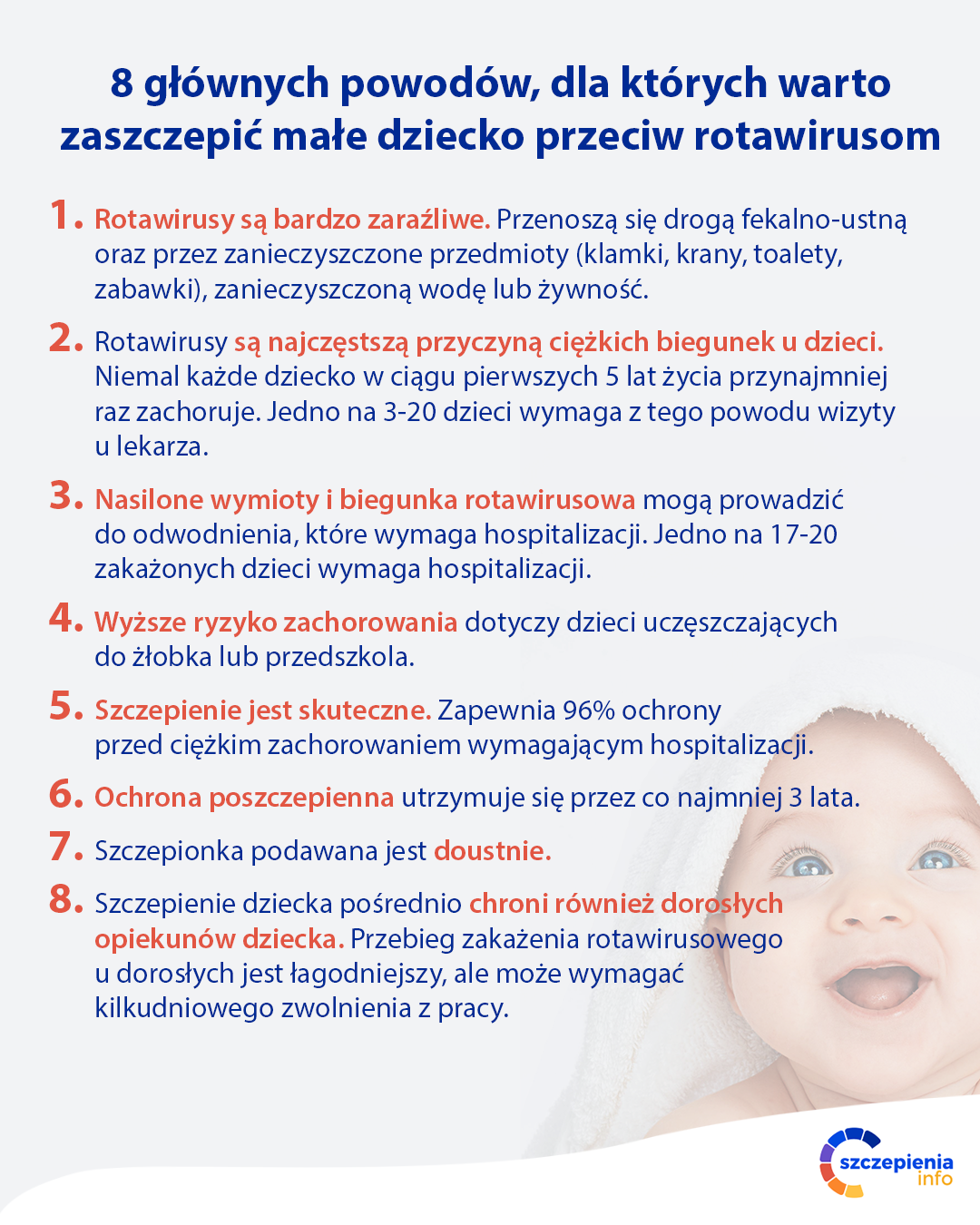 Prawie każde dziecko do 5 r.ż. przechodzi przynajmniej jedną infekcję rotawirusową (69% dzieci – dwie infekcje, a 42% trzy infekcje). Pierwsza infekcja ma zazwyczaj najcięższy przebieg. Objawy wywołane zakażeniem rotawirusami są szczególnie niebezpieczne dla najmłodszych, poniżej 6 mies. – przebieg choroby może być gwałtowny i nieprzewidywalny. Małe dzieci zdecydowanie łatwiej ulegają odwodnieniu w wyniku gwałtownej biegunki i wymiotów.