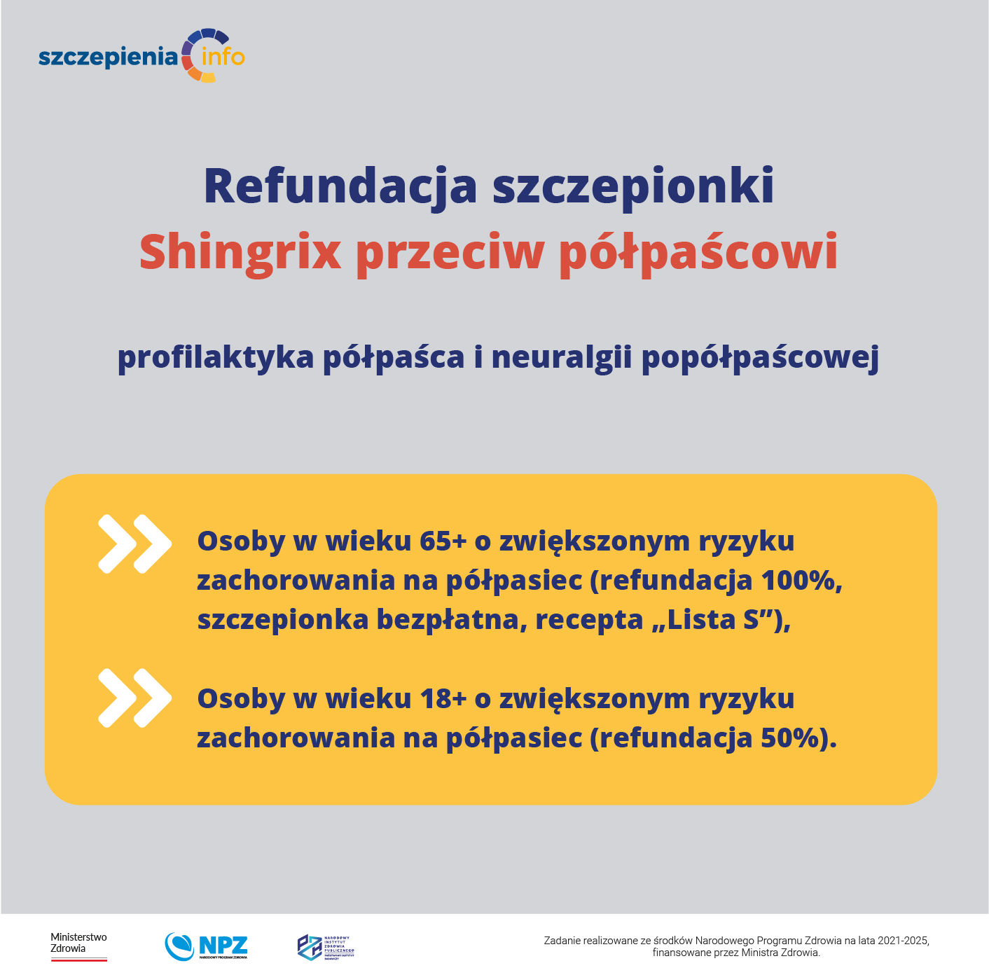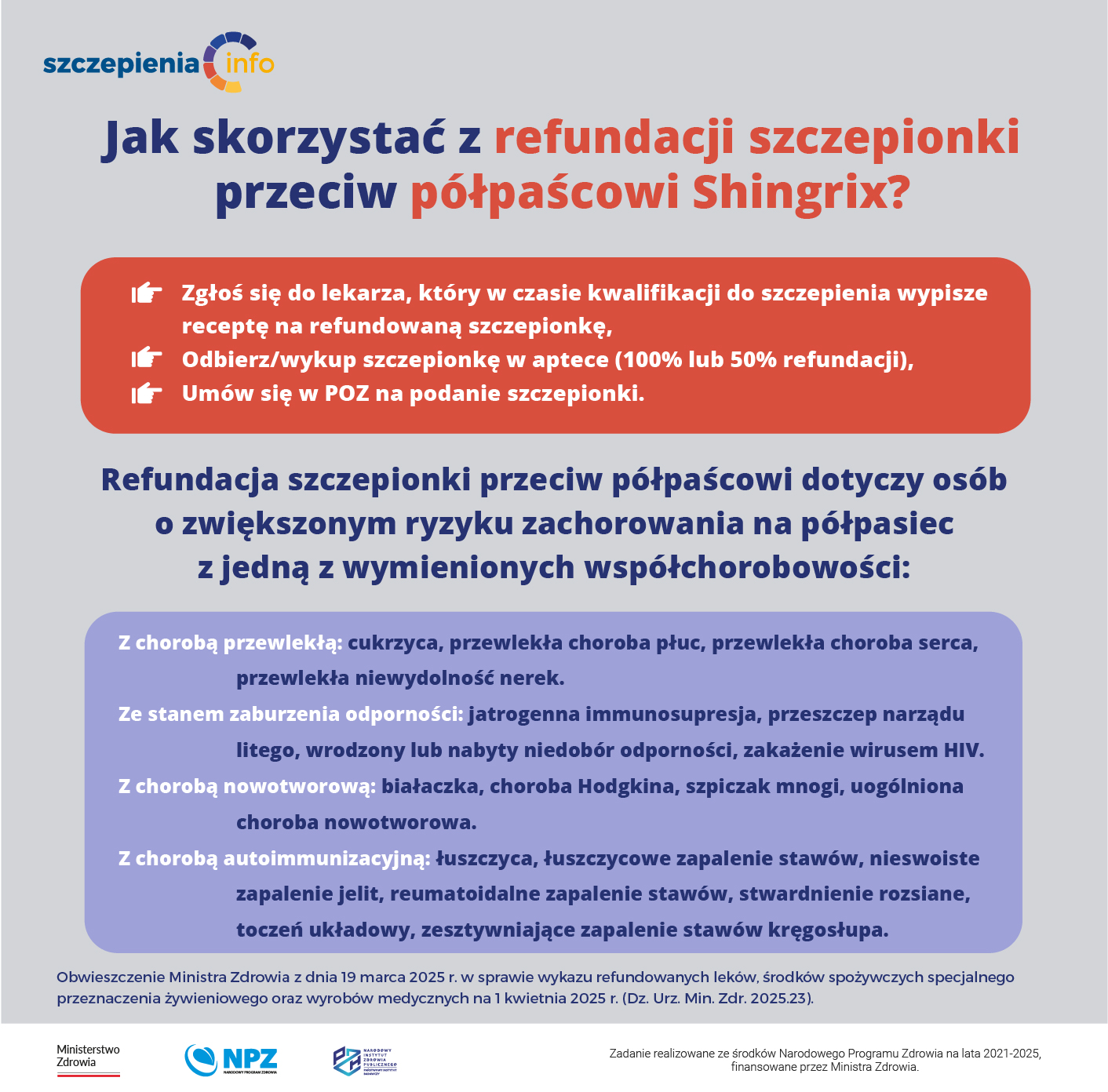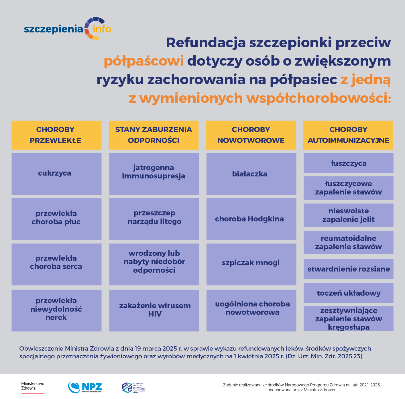 - Osobom w wieku 18+ o zwiększonym ryzyku zachorowania na półpasiec (refundacja 50%).