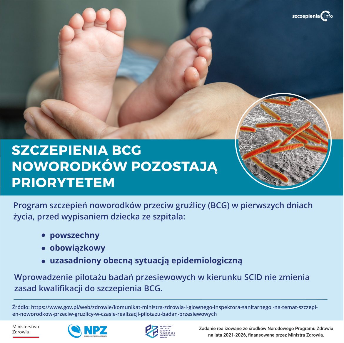 Wprowadzenie pilotażu badań przesiewowych w kierunku SCID nie zmienia zasad kwalifikacji do szczepienia BCG (więcej w komunikacie MZ i GIS oraz stanowisku Krajowego Konsultanta ds Neonatologii).