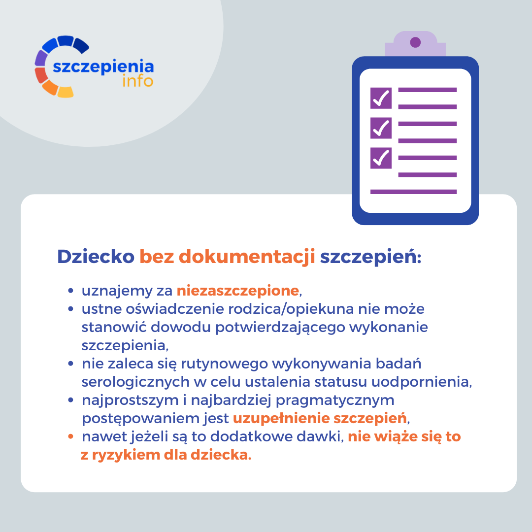 W sytuacji, kiedy nie ma dostępu do dokumentacji o zrealizowanych szczepieniach ochronnych dziecka (książeczki zdrowia, karty szczepień), również w sytuacji, kiedy dokumentacja uległa zniszczeniu, lekarz kwalifikujący dziecko do szczepienia uznaje dziecko za niezaszczepione.