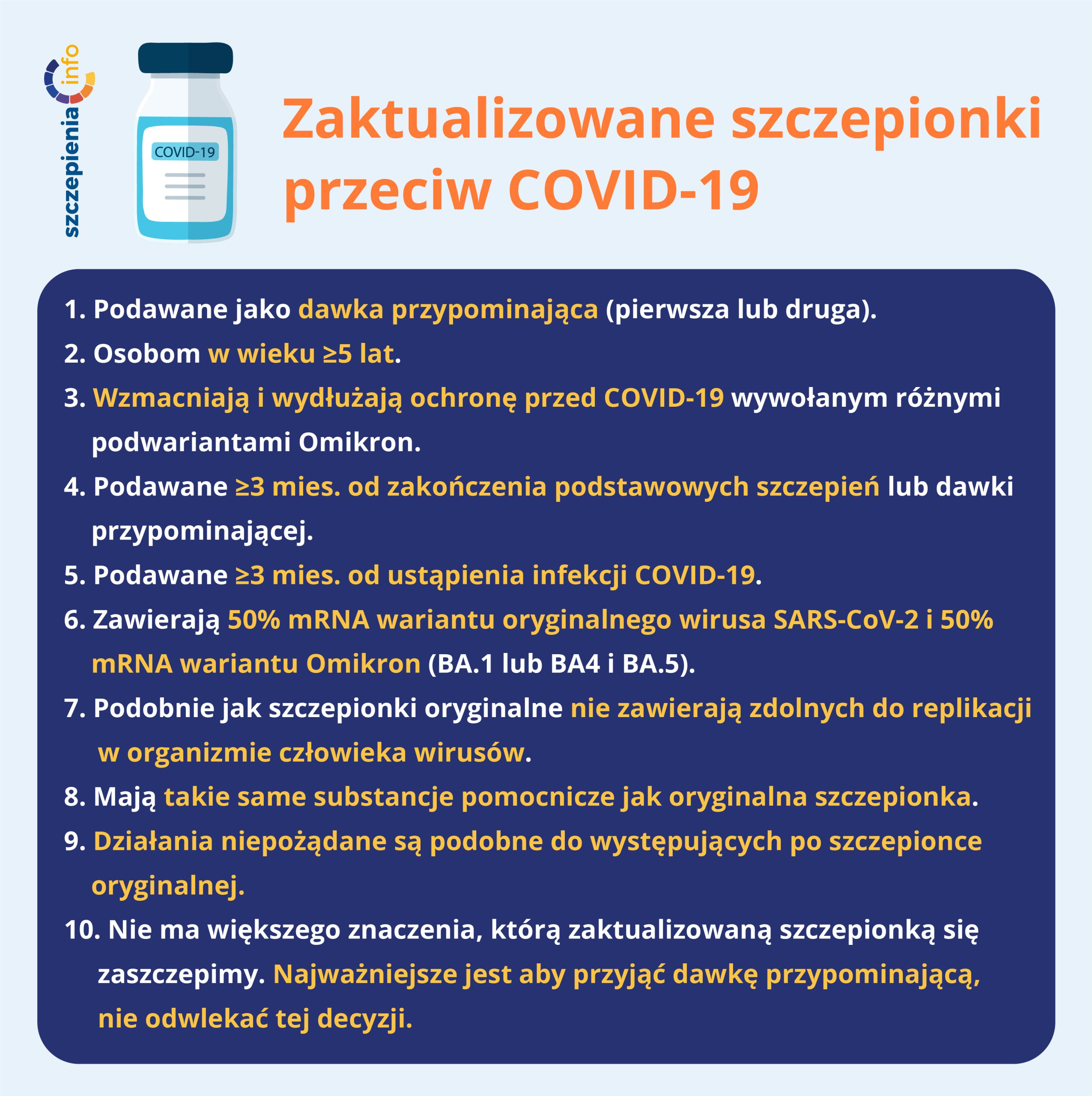 Szczepienia drugą dawką przypominającą będą wykonywane szczepionką o zaktualizowanym składzie dla wariantu Omikron. W przypadku dostępności w punkcie szczepień, szczepionkę o zaktualizowanym składzie można również podać jako pierwszą dawkę przypominającą.