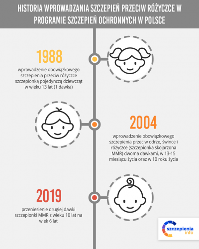 Poniżej przedstawiono najważniejsze daty związane z realizacją szczepień przeciw różyczce w przeszłości.