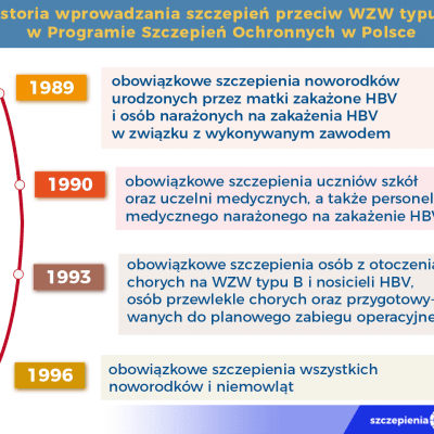 - 1994-1996 – objęcie obowiązkowymi szczepieniami wszystkich noworodków i niemowląt. Program wprowadzano kolejno w poszczególnych województwach, zależnie od kształtowania się zapadalności na wzw B wśród małych dzieci: w 13 województwach w 1994 roku, w dalszych 14 województwach w 1995 roku, a w pozostałych 22 województwach w 1996 roku.