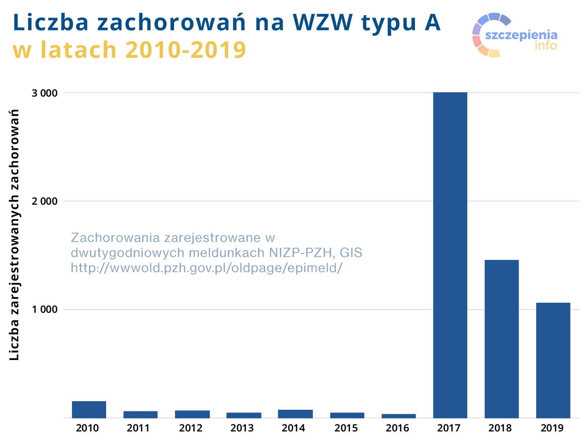 W 2017 roku nastąpił ponad 80. krotny wzrost zgłaszanych przypadków i zapadalności na wzw A w porównaniu do lat poprzednich. Wzrost ten był związany z wystąpieniem międzynarodowego ogniska wzw A wśród mężczyzn mających kontakty seksualne z mężczyznami (MSM) w Europie, które objęło swoim zasięgiem większość krajów UE. W Polsce, zgodnie z danymi NIZP-PZH w 2017 roku odnotowano łącznie 3 006 przypadków wzw A (zapadalność 7,8/100 tys.), w porównaniu do 2016 r. (35; 0,09).