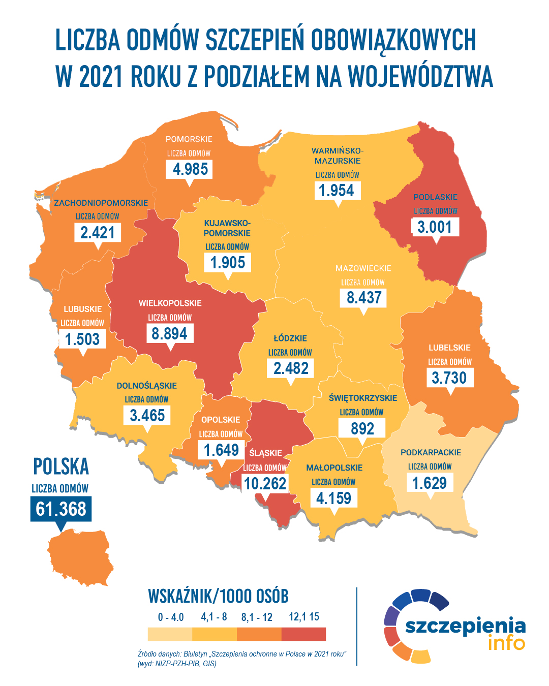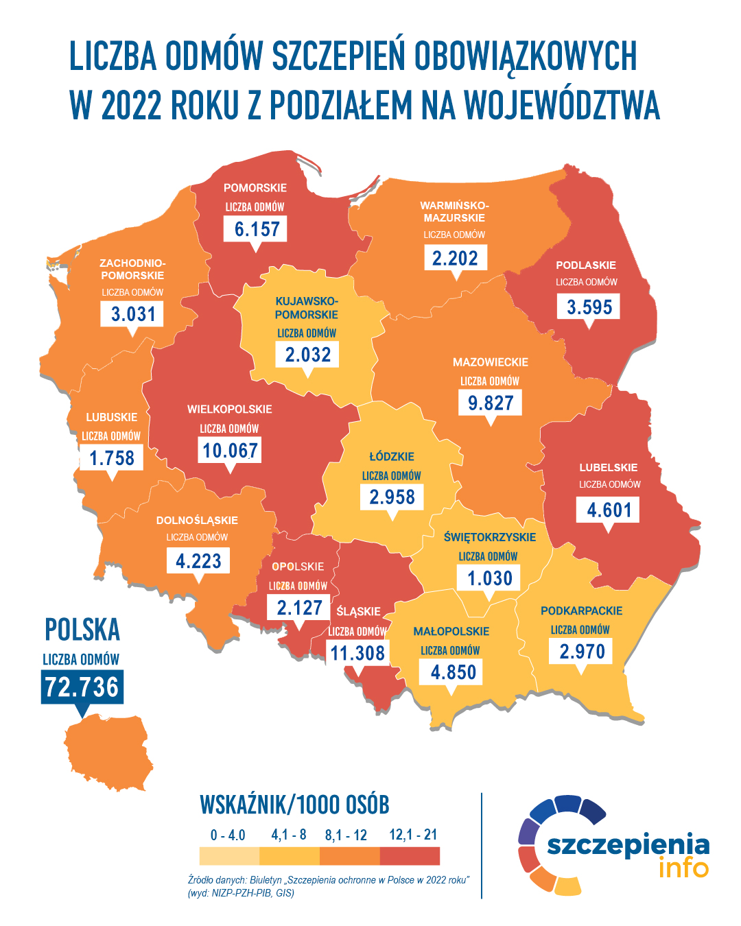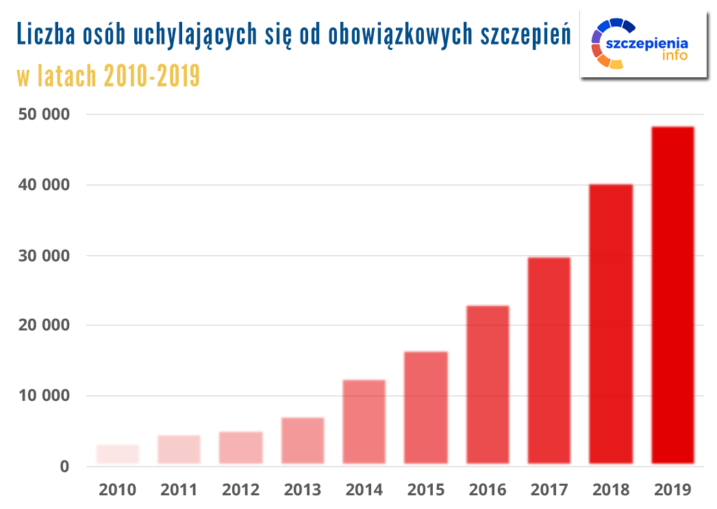 Liczba przypadków uchylania się od obowiązkowych szczepień w przeliczeniu na 1 000 osób w wieku 0-19 lat wynosiła: 0,7 w 2012 roku; 0,97 w 2013 roku; 1,71 w 2014 roku; 2,3 w 2015 roku; 3,2 w 2016 roku; 4,1 w 2017 roku, 5,5 w 2018 roku, 6,6 w 2019 roku, 6,9 w 2020 roku, 8,3 w 2021 roku oraz 9,9 w 2022 roku. W 2023 roku odnotowano 11,8 uchyleń /1000 osób w wieku 0-19 lat.