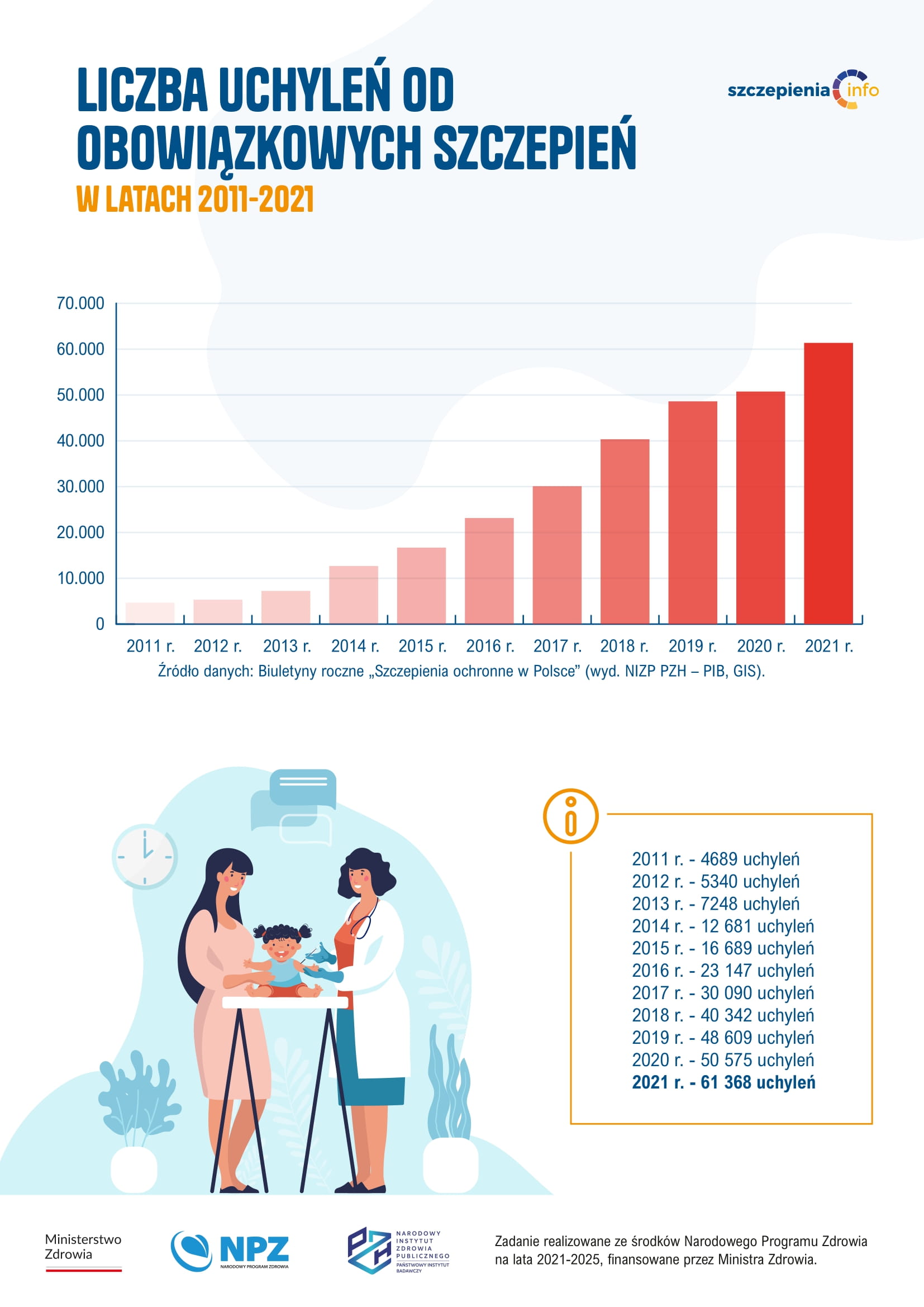 Narodowy Instytut Zdrowia Publicznego PZH – PIB gromadzi informacje dotyczące liczby osób uchylających się od szczepień obowiązkowych. Liczba ta jest odnoszona do osób podlegających szczepieniom w danym roczniku. Obejmuje dzieci i młodzież do 19 roku życia podlegające szczepieniom wg obowiązkowego Programu Szczepień Ochronnych. Liczba uchyleń wskazana w danym roku obejmuje dane zagregowane w kolejnych latach. Opracowane dane są udostępnione na stronie NIZP PZH-PIB w Biuletynach Szczepienia Ochronne. Przykładowo dane za 2022 rok dostępne są w Biuletynie Szczepienia Ochronne za 2022 rok na 91 stronie.