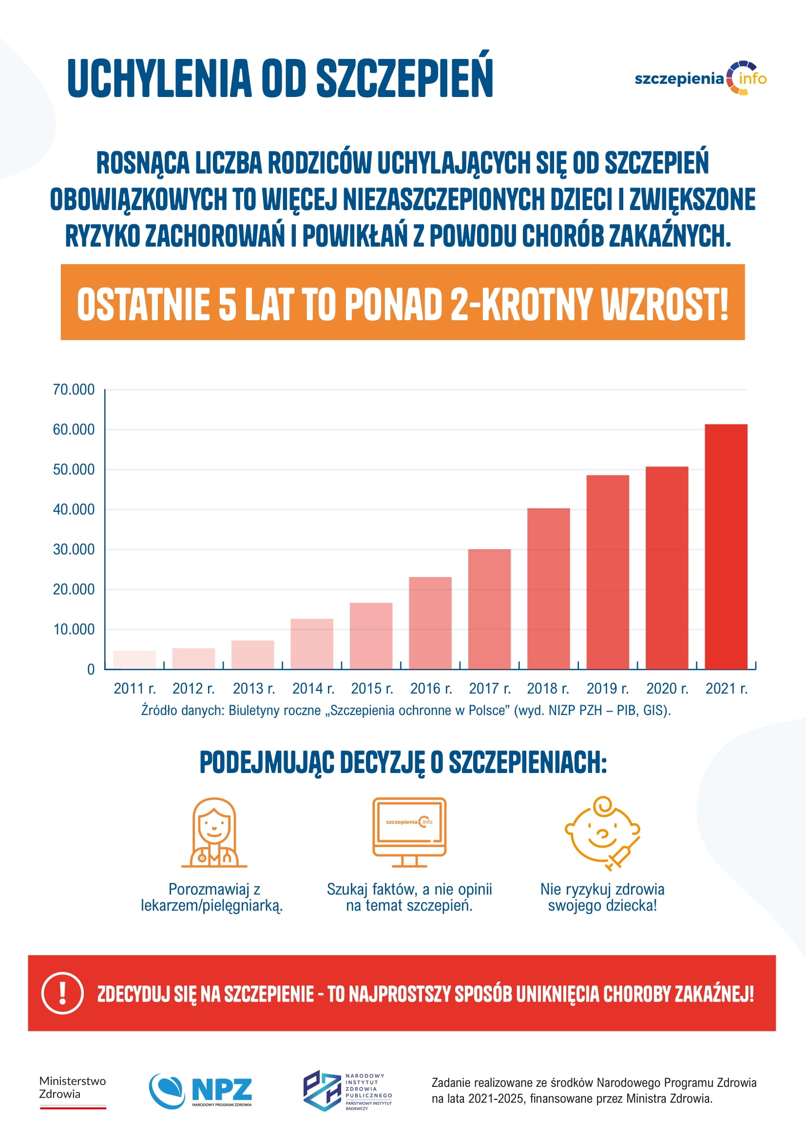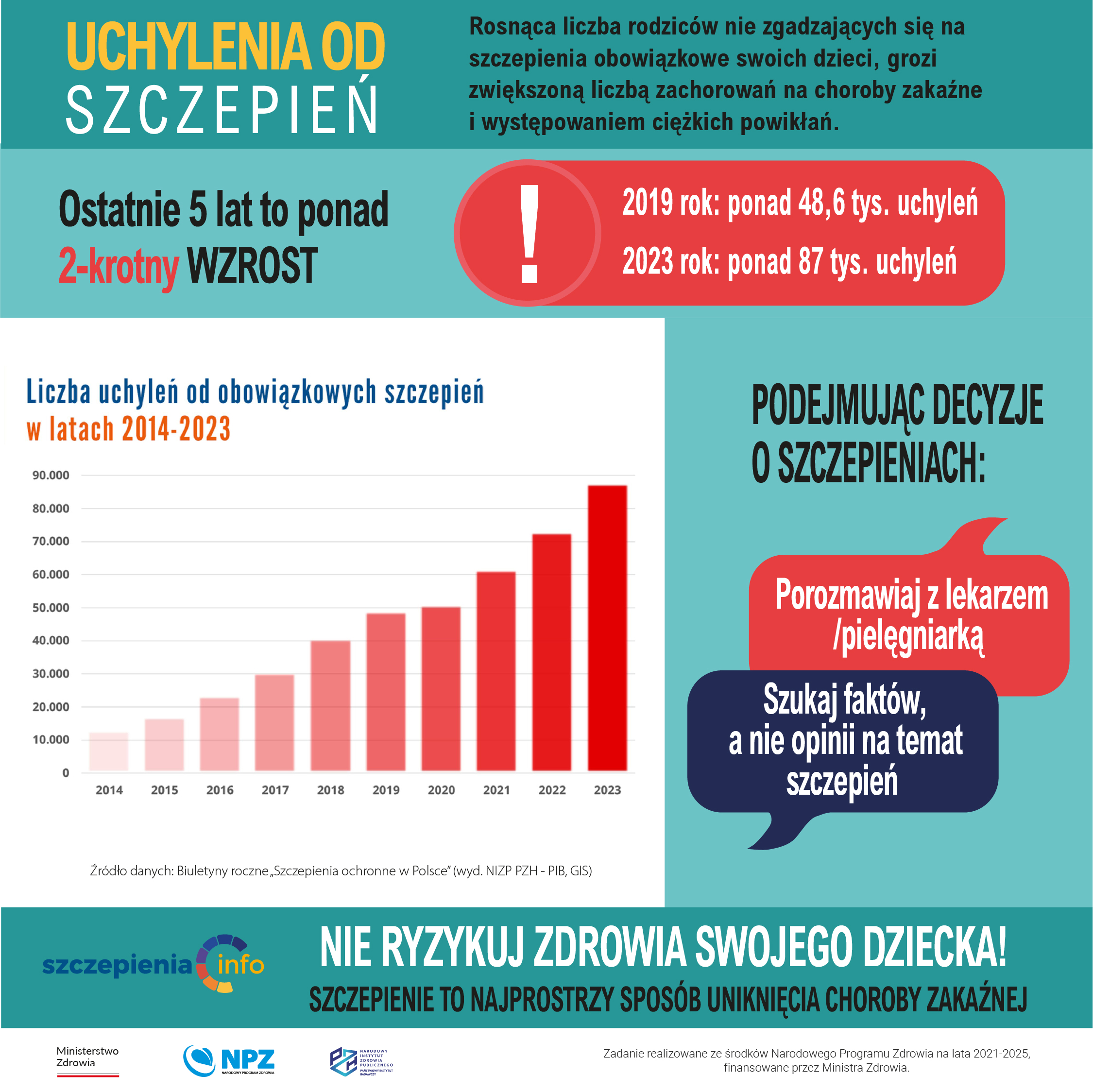 W czasie ostatnich 5 lat liczba uchyleń od szczepień obowiązkowych zwiększyła się prawie 2-krotnie, od 48,6 tys. uchyleń w 2019 roku do 87,3 tys. uchyleń w 2023 roku.