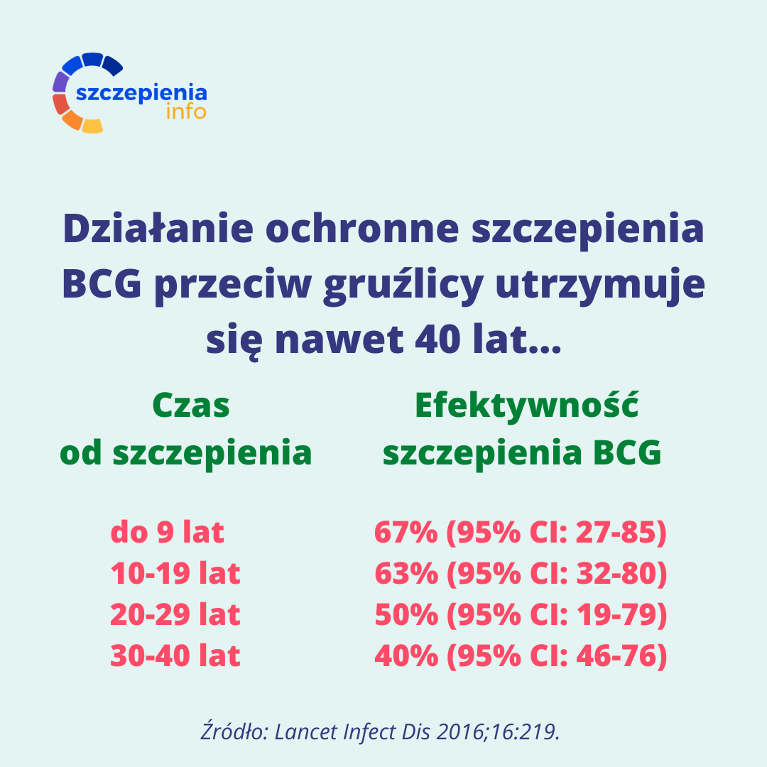 Zgodnie z wynikami badań, jedna dawka szczepionki BCG przeciw gruźlicy chroni dziecko przed najcięższymi postaciami gruźlicy (gruźlica rozsiana i gruźlicze zapalenie opon mózgowo-rdzeniowych) i znacznie zmniejsza ryzyko jakiegokolwiek zachorowania na tę chorobę. Wyniki badań przeprowadzone metodą metaanalizy wskazują, że szczepienie BCG zmniejsza ryzyko czynnej gruźlicy o około 50%, choć możliwe są istotne różnice w skuteczności w różnych grupach wiekowych – u noworodków i niemowląt chroni przed gruźlicą w około 80% przypadków, natomiast szczepienie starszych dzieci i dorosłych jest znacznie mniej skuteczne. Działanie ochronne szczepienia BCG utrzymuje się więcej niż 20 lat, a podawanie dodatkowych dawek nie zwiększa już skuteczności szczepienia. W dużym, retrospektywnym badaniu prowadzonym w Norwegii długotrwałe efekty szczepienia BCG oceniono na 67% (CI:27-85) do 9 lat od podania szczepionki, 63% (CI:32-80) w okresie 10-19 lat od podania szczepionki, 50% (95% CL:19-79) w okresie 20-29 lat od oddania szczepionki i 40% (95% CI: 46-76) w okresie 30-40 lat od podania szczepionki.