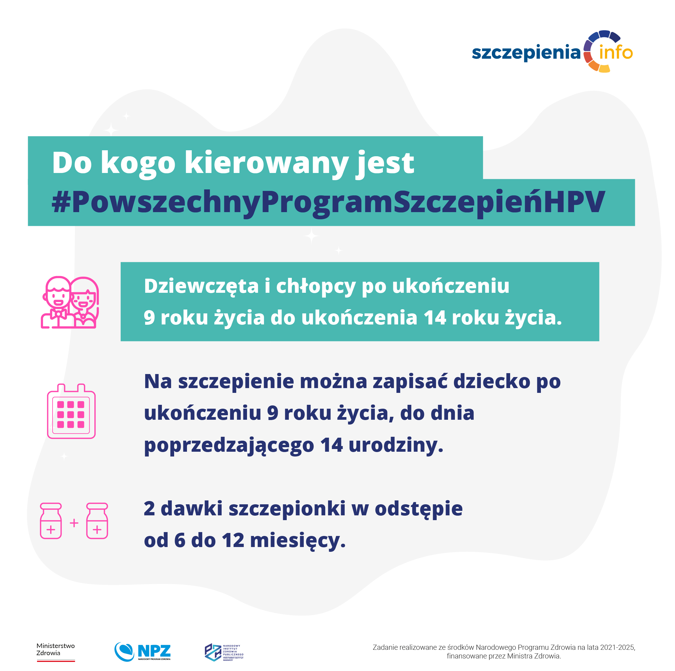 Zgodnie z aktualnymi zaleceniami Ministra Zdrowia dotyczącymi wieku pacjentów kwalifikujących się do Powszechnego Programu bezpłatnych Szczepień przeciw HPV, szczepienia te przeprowadzane są u dziewcząt i chłopców po ukończeniu 9. roku życia, do ukończenia 14.roku życia, tj. od dnia 9 urodzin, do dnia poprzedzającego 14 urodziny- w schemacie dwudawkowym (zalecenia obowiązują od 1 września br.).