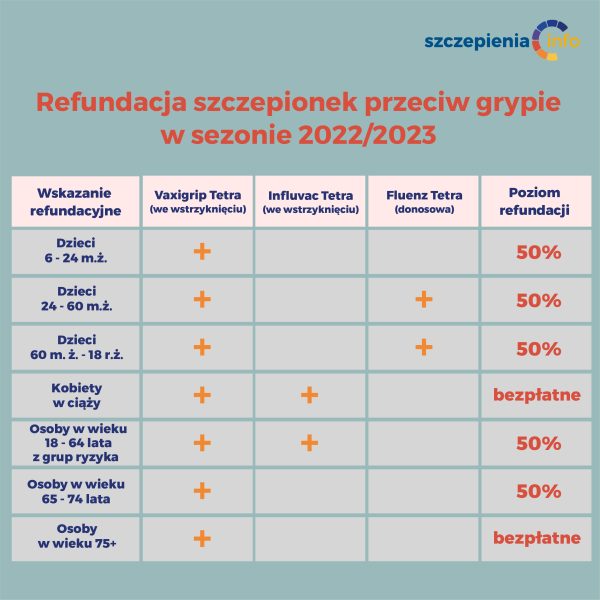 W sezonie 2022/2023 następujące szczepionki przeciw grypie objęte są refundacją (100% lub 50%).