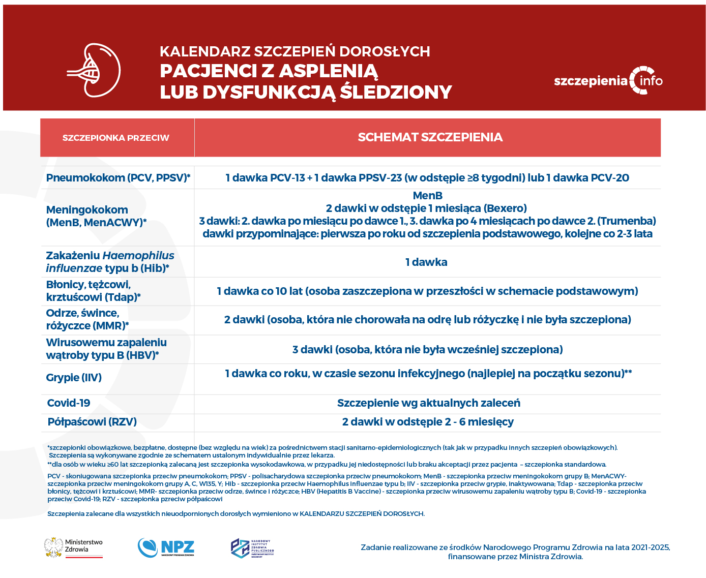 Kalendarz szczepień dorosłych - Pacjenci z asplenią lub dysfunkcją śledziony