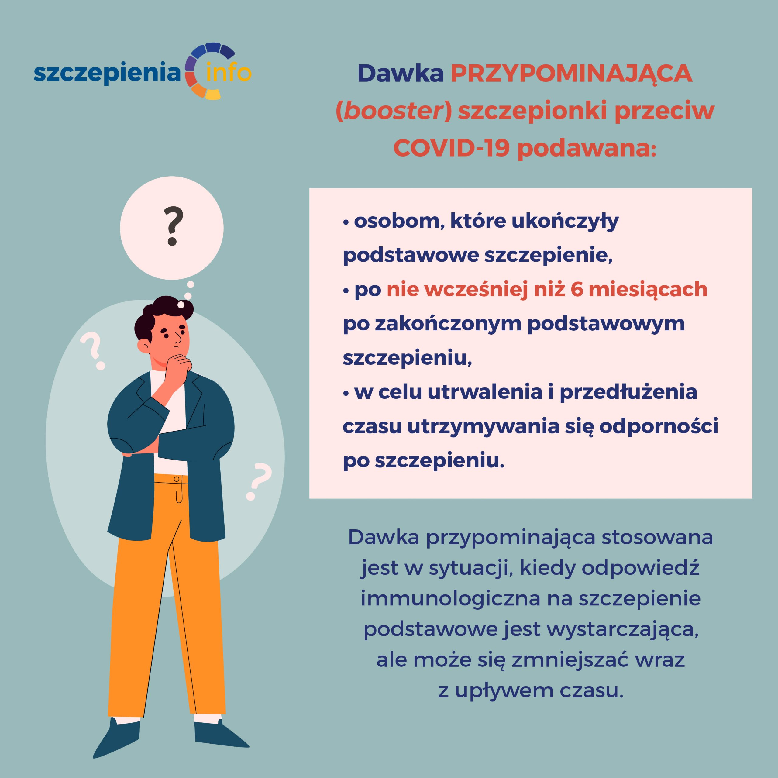 Minister Zdrowia mając na uwadze zalecenia Rady Medycznej oraz Zespołu ds. Szczepień Ochronnych, poinformował, że od 2 listopada 2021 r. rozpoczną się szczepienia dawką przypominającą dla wszystkich osób, które ukończyły 18 rok życia i otrzymały pełny schemat szczepienia (dwie dawki) preparatami Comirnaty (Pfizer-BioNTech), Spikevax (Moderna) lub Vaxzevria (AstraZeneca) lub jedną dawkę szczepionki COVID-19 Vaccine Janssen.