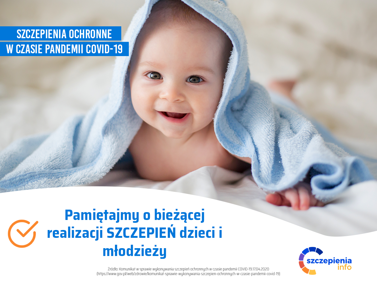 W nawiązaniu do rekomendacji Ministra Zdrowia, Głównego Inspektora Sanitarnego oraz konsultantów krajowych w dziedzinie epidemiologii, medycyny rodzinnej, neonatologii i pediatrii w sprawie odroczenia realizacji szczepień obowiązkowych w ramach Programu Szczepień Ochronnych u dzieci do 18 kwietnia 2020 roku, Minister Zdrowia oraz Główny Inspektor Sanitarny, w oparciu o stanowiska Zespołu ds. Szczepień Ochronnych oraz Polskiego Towarzystwa Wakcynologii oraz kluczowych instytucji zdrowia publicznego (WHO, CDC, NHS, NCIRS) zalecają wznowienie bieżącej realizacji szczepień obowiązkowych w ramach Programu Szczepień Ochronnych u dzieci, z zachowaniem zasad bezpieczeństwa przeciwepidemicznego w czasie szczepienia, ze szczególnym uwzględnieniem: