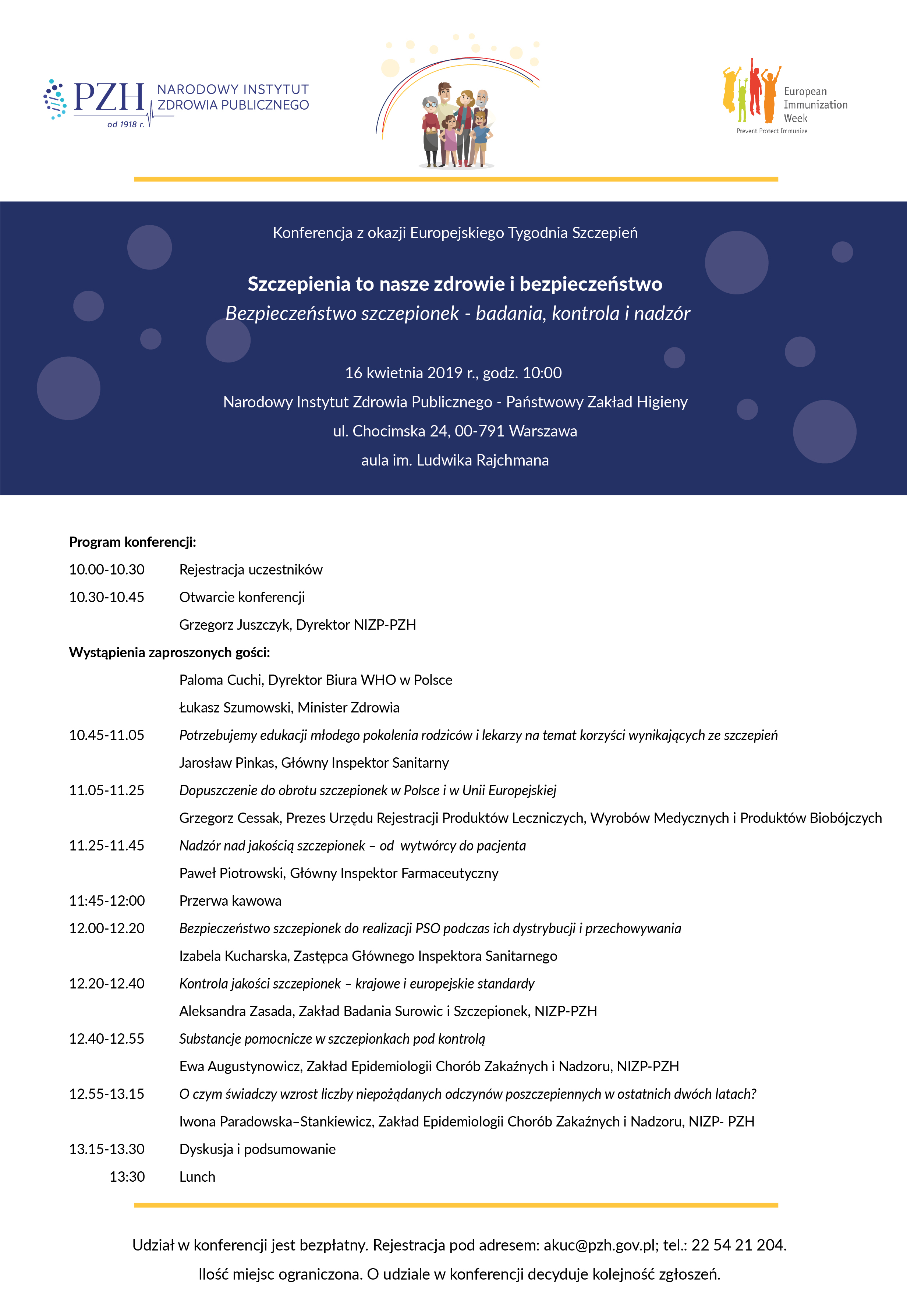 Konferencja „Szczepienia to nasze zdrowie i bezpieczeństwo. Bezpieczeństwo szczepionek – badania, kontrola i nadzór” odbędzie się we wtorek, dnia 16 kwietnia 2019 r., w auli im. L. Rajchmana w siedzibie NIZP-PZH. Dla osób, które nie będą mogły uczestniczyć osobiście w wydarzeniu przygotowaliśmy relację na żywo na naszym profilu oraz stronie internetowej Instytutu. Zapraszamy do oglądania!