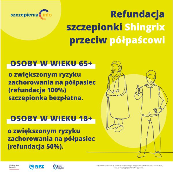 - Osoby w wieku 65+ o zwiększonym ryzyku zachorowania na półpasiec (refundacja 100%, na receptę dla pacjenta – Lista S), szczepionka bezpłatna,