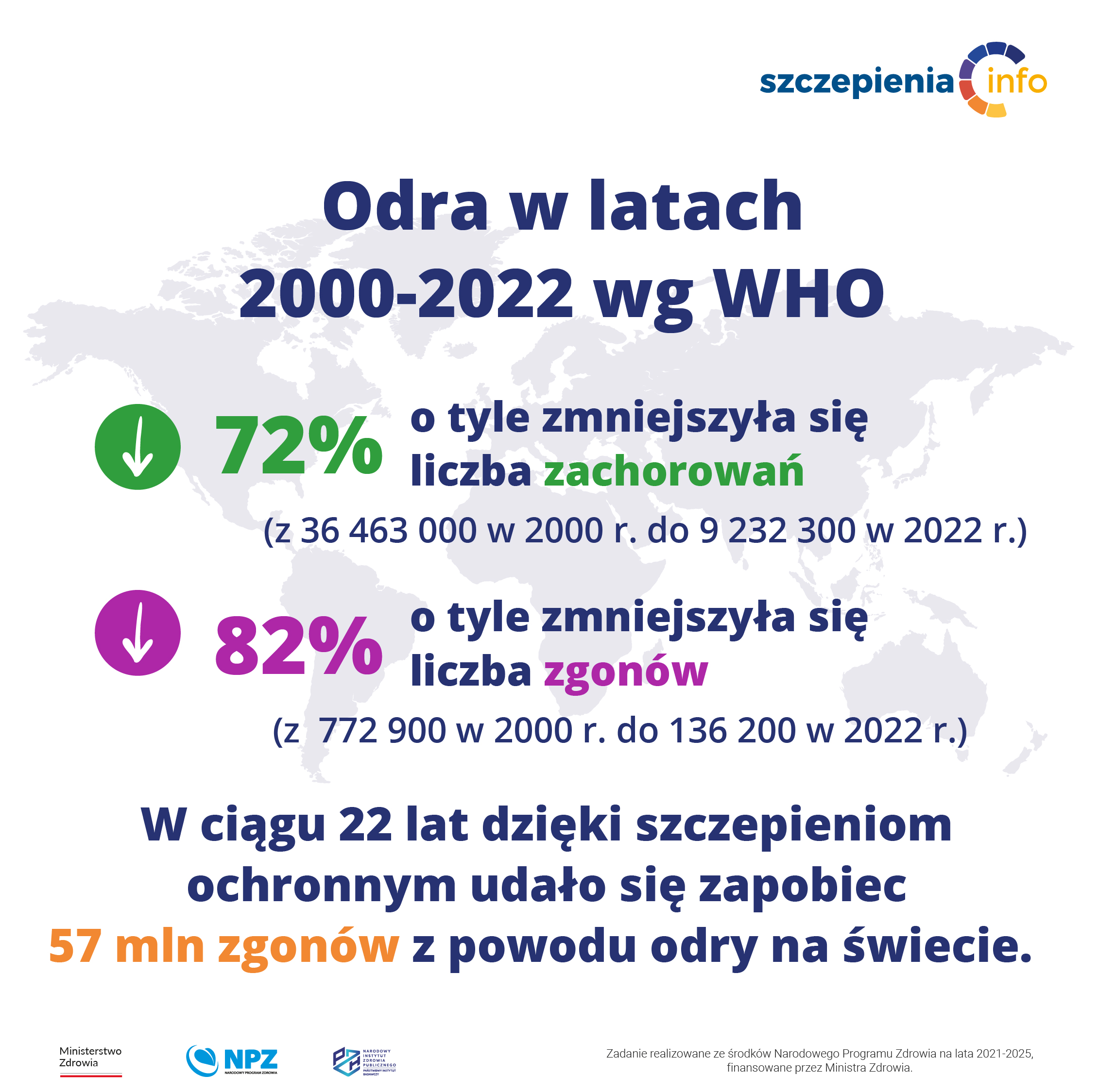 W ciągu ostatnich 20 lat poczyniliśmy ogromne postępy w epidemiologii odry na świecie. W latach 2000–2022 dzięki prowadzonym programom szczepień liczba zachorowań zmniejszyła się o 72% – z 36 463 000 w 2000 roku do 9 232 300 w 2022 roku. Liczba zgonów zmniejszyła się o 82% – z 772 900 w 2000 roku do 136 200 w 2022 roku. W ciągu 22 lat dzięki szczepieniom ochronnym udało się zapobiec 57 mln zgonów z powodu odry.
