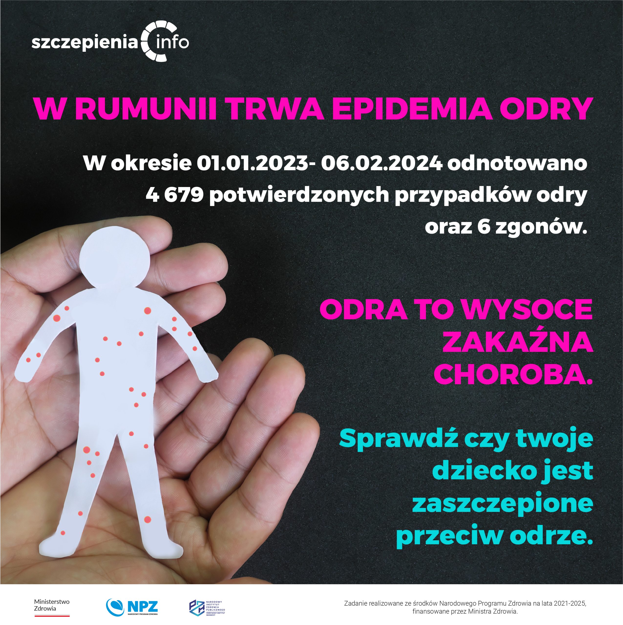 Ministerstwo Zdrowia Rumunii ogłosiło stan epidemii odry, na podstawie alarmującego zwiększenia liczby zachorowań na odrę oraz dużej liczby hospitalizacji zakażonych dzieci na oddziałach pediatrycznych i zakaźnych. Poinformowano również o śmiertelnym przypadku z powodu odry. Z powodu ostrych objawów odry zmarło 7-miesięczne niemowlę, nieszczepione ze względu na zbyt młody wiek, a zachorowało na odrę po kontakcie z 3-letnim nieszczepionym bratem.