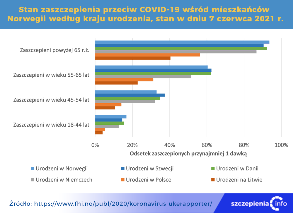 Najnowszy tygodniowy raport epidemiologiczny Norweskiego Instytutu Zdrowia Publicznego wykazuje, że po 5 miesiącach szczepień przeciw COVID-19, stan zaszczepienia co najmniej 1 dawką szczepionki  wśród Polaków powyżej 65 roku życia mieszkających w Norwegii wynosi 56%, w porównaniu z ponad 90% stanem zaszczepienia wśród osób urodzonych w krajach skandynawskich (Norwegii, Szwecji oraz Danii).