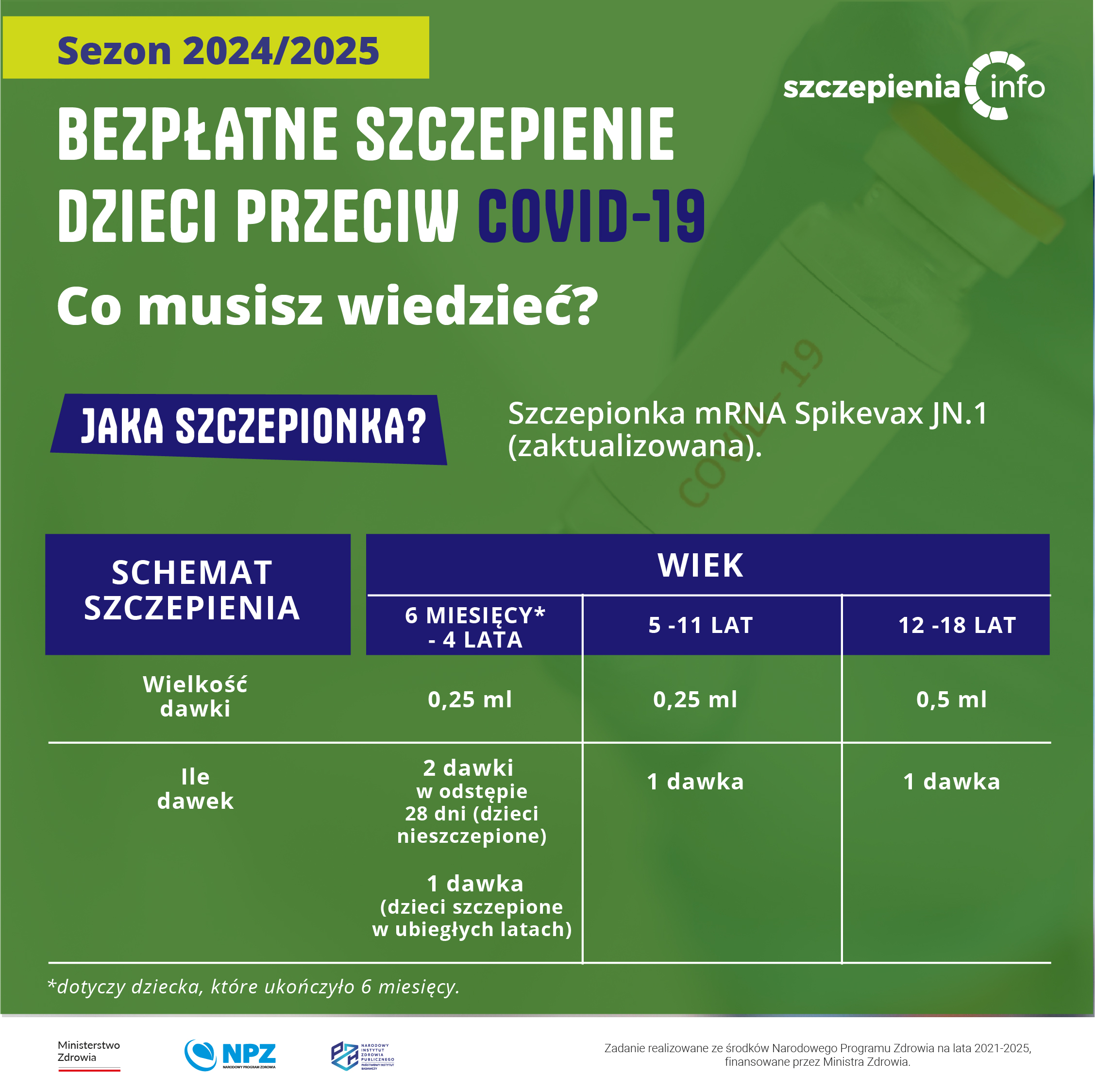 - Szczepienie jest realizowane szczepionką przeznaczoną dla dzieci w wieku 6 miesięcy -11 lat o nazwie Spikevax JN.1 w dawce 0,25 ml (50 mikrogramów mRNA) w poniższych schematach: