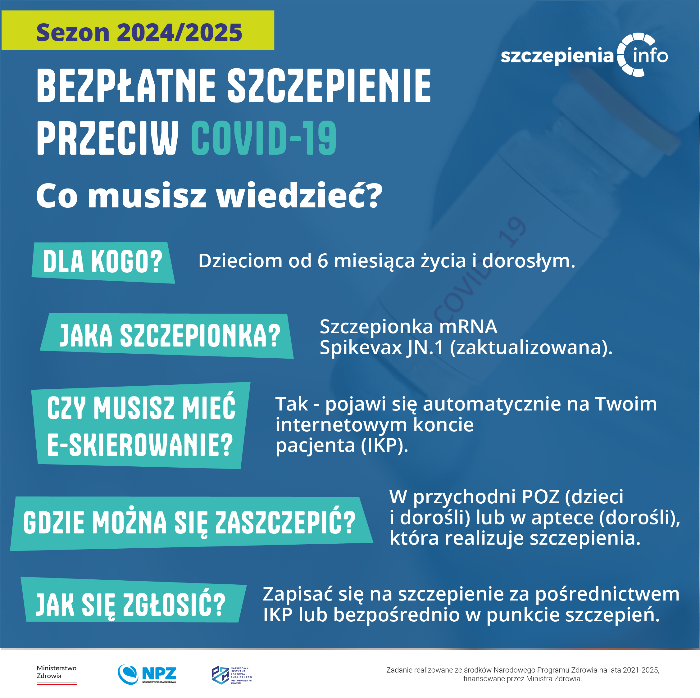 Minister Zdrowia informuje w komunikacie, że rozpoczynają się bezpłatne szczepienia przeciw COVID-19 dzieci młodszych. Dostępna jest szczepionka Spikevax JN.1. w dawce 0,25 ml. Szczepienie zalecane jest szczególnie dzieciom o największym ryzyku przebiegu ciężkiego COVID-19.