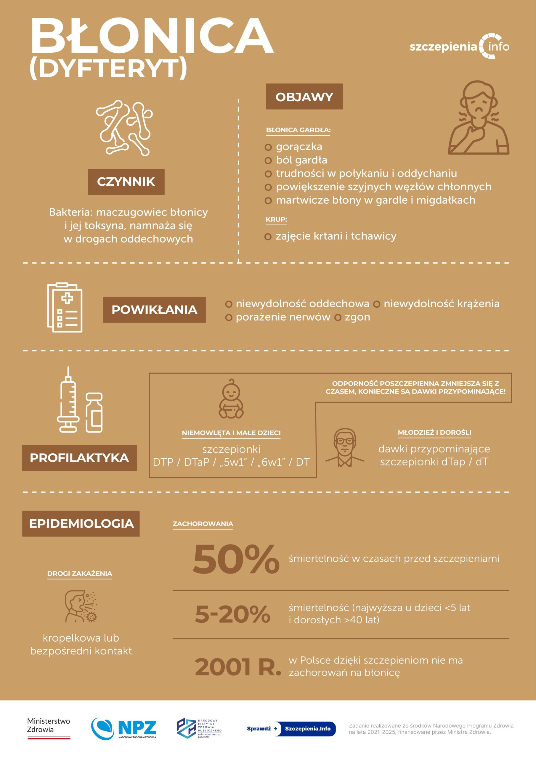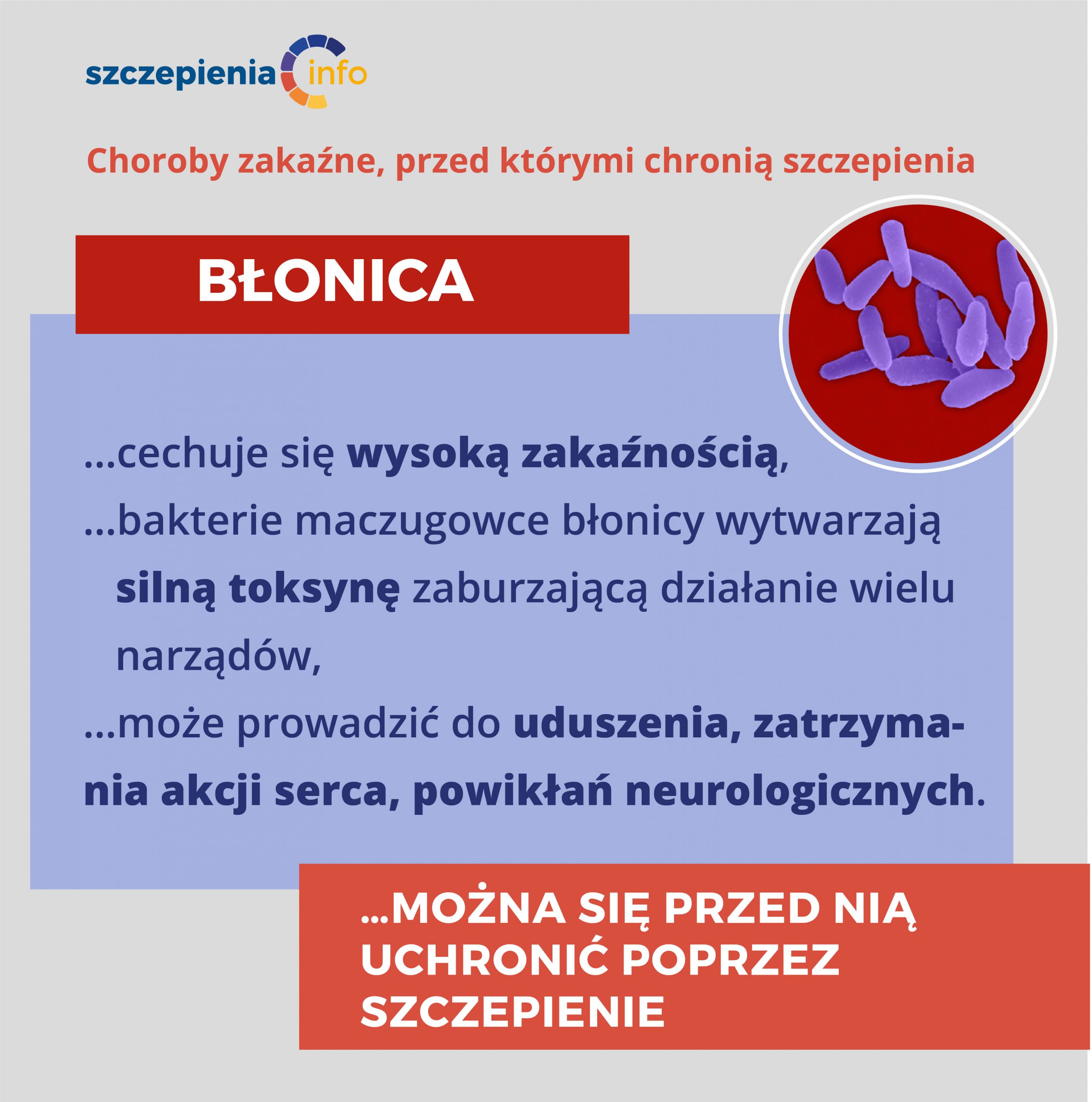 Błonica, określana też jako dyfteryt, krup lub dławiec, jest ostrą i ciężką chorobą zakaźną, wywoływaną przez bakterie zwane maczugowcami błonicy. Do zakażenia dochodzi drogą kropelkową lub przez bezpośredni kontakt z osobą chorą lub nosicielem, rzadziej przez kontakt z zakażonymi zwierzętami, takimi jak koty, psy i konie. Objawy pojawiają się początkowo w miejscu kolonizacji bakterii, czyli w gardle, na migdałkach podniebiennych, w krtani, rzadziej w nosie, na spojówkach i błonach śluzowych narządów płciowych. W miejscach wniknięcia do organizmu bakterie wywołują martwicę tkanek, tzw. pseudobłony rzekome mające postać szarych, półprzezroczystych lub czarnych nalotów, krwawiących przy próbie oderwania. Razem z powiększającymi się szyjnymi węzłami chłonnymi i obrzękiem szyi mogą prowadzić do zwężenia światła gardła i krtani, oraz zgonu w wyniku niewydolności oddechowej lub zatrzymania krążenia. Maczugowce błonicy wydzielają silną toksynę błoniczą, która rozprzestrzeniając się w organizmie, może prowadzić do zaburzeń w funkcjonowaniu wielu narządów, tj. zapalenia mięśnia sercowego, martwicy cewek nerkowych. Mogą również wystąpić powikłania neurologiczne, takie jak porażenie podniebienia i tylnej ściany gardła, porażenie mięśni odpowiedzialnych za ruchy gałek ocznych, porażenia kończyn i mięśni twarzy.