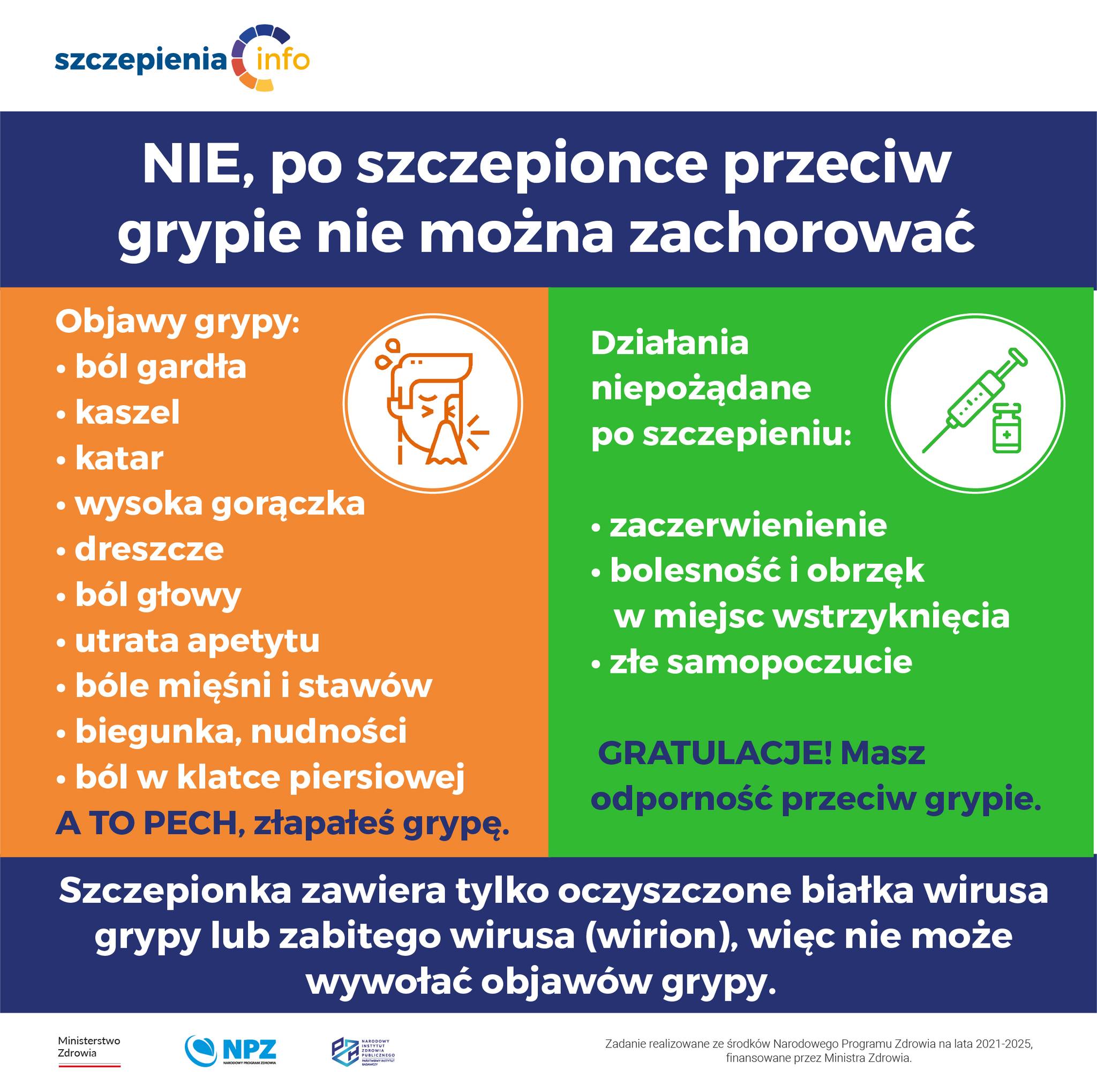 Grypa jest ostrą chorobą zakaźną, wywoływaną przez wirusy grypy. Do zakażenia dochodzi drogą kropelkową lub przez kontakt ze skażoną powierzchnią. Okres inkubacji wynosi 1-4 dni. Wirusy grypy atakują komórki nabłonka dróg oddechowych, w których się namnażają. W konsekwencji powodują ich zniszczenie, co z kolei ułatwia rozwój infekcji bakteryjnych. Objawy grypy są podobne do wielu innych ostrych chorób infekcyjnych i są zarówno miejscowe (kaszel, ból gardła, katar), oraz w postaci nagłej, wysokiej gorączki powyżej 38ºC, dreszczy, bólów mięśniowo-stawowych, bólów głowy, bólu w klatce piersiowej, złego samopoczucia, braku łaknienia, nudności i wymiotów. Choroba trwa, o ile nie dojdzie do powikłań, około 7 dni. Kaszel i złe samopoczucie mogą utrzymywać się ponad 2 tygodnie. Powodem ciężkiego przebiegu grypy są powikłania pogrypowe, m.in. zapalenie płuc i oskrzeli, zapalenie ucha środkowego, zapalenie mięśnia sercowego i osierdzia, zaostrzenie istniejących chorób przewlekłych, powikłania neurologiczne.
