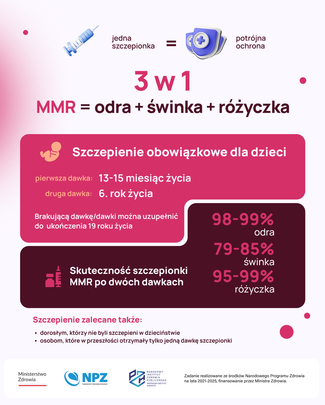 Odra to ostra, wirusowa choroba zakaźna, która bardzo łatwo się rozprzestrzenia wśród nieuodpornionych osób w każdym wieku i może powodować epidemię. Nie należy jej lekceważyć ponieważ powikłania z nią związane mogą być bardzo groźne. Źródłem zakażenia jest chory człowiek. Zakażenie szerzy się drogą kropelkową oraz przez bezpośrednią styczność z wydzieliną z jamy nosowo-gardłowej chorej osoby. Objawy występują po 10-12 dniach od zakażenia. Na 2-4 dni przed pojawieniem się charakterystycznej wysypki występuje gorączka, złe samopoczucie, zapalenie spojówek, katar, kaszel. Wraz z rozwojem choroby temperatura wzrasta do 39-41°C. W jamie ustnej pojawiają się białe wykwity otoczone czerwoną linią (plamki Koplika), a następnie czerwona wysypka stopniowo zlewa się w plamy i obejmuje całą głowę i ciało. Około 30% zachorowań przebiega z powikłaniami szczególnie wśród dzieci do 5 roku życia i dorosłych w wieku powyżej 20 lat. Najczęstsze powikłania to zapalenie ucha środkowego, które prowadzi do utraty słuchu, biegunka, zapalenie płuc, ostre zapalenie mózgu prowadzące do obrzęku mózgu, zaburzenia wzroku prowadzące do ślepoty, rzadkie ciężkie uszkodzenia mózgu znane jako podostre stwardniające zapalenie mózgu (SSPE), którego objawy pojawiają się kilka lat po chorobie. Odra jest najbardziej niebezpieczna dla dzieci do 5 lat oraz osób z zaburzeniami układu odporności. Co czwarta chora osoba wymaga hospitalizacji. Jedna na 1000 chorych umiera w przebiegu choroby.