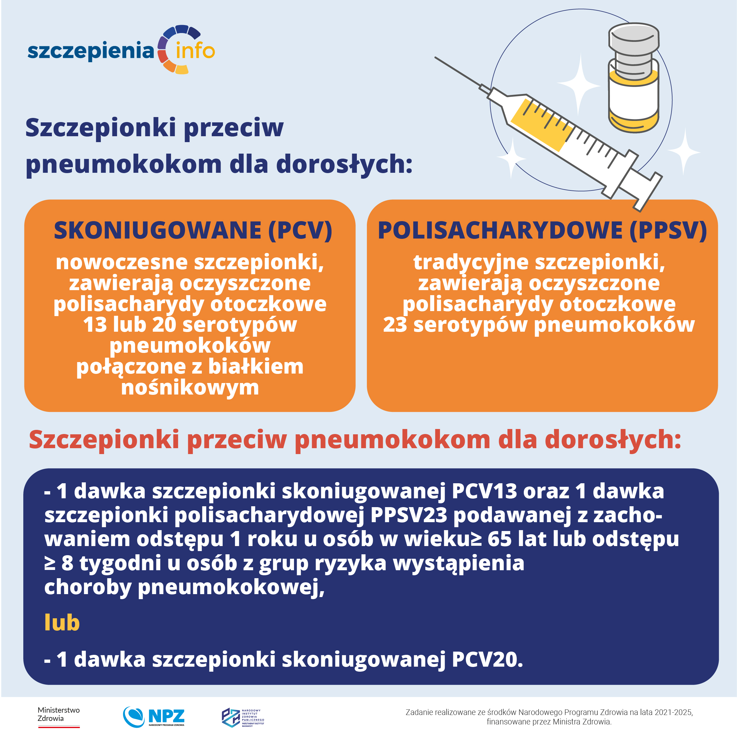 Znane są dwa rodzaje szczepionek przeciw pneumokokom. Szczepionki skoniugowane zawierają oczyszczone polisacharydy otoczkowe od 10 do 21 serotypów  pneumokoków połączonych z nośnikiem białkowym. Są stosowane u dzieci od 6 tyg. życia, młodzieży i dorosłych. Chronią przed zapaleniem opon mózgowo-rdzeniowych, sepsą, bakteriemią, zapaleniem płuc oraz zapaleniem ucha wywoływanym przez serotypy pneumokoków zawartych w danej szczepionce. W zależności od wieku szczepienie obejmuje 1-4 dawki. Szczepionki polisacharydowe zawierają oczyszczone polisacharydy otoczkowe 23 serotypów pneumokoków do stosowania u osób od 2 lat, ale głównie dorosłych powyżej 65 lat jako ochrona przed zapaleniem płuc oraz IChP, głównie chorych z przewlekłymi chorobami układu oddechowego, układu krążenia oraz z zaburzeniami odporności.
