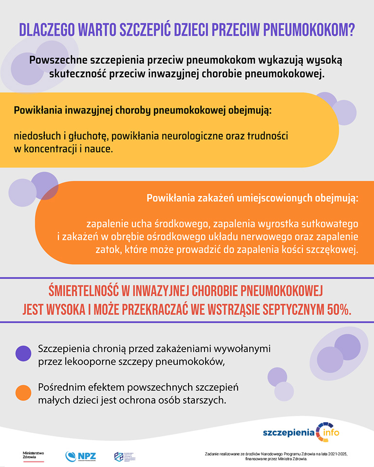 Zakażenia pneumokokowe są wywoływane przez bakterię zwaną pneumokokiem wytwarzającą otoczkę polisacharydową, która warunkuje rozwój określonych objawów. Spośród ponad 100 znanych serotypów pneumokoków, tylko niektóre są niebezpieczne dla człowieka. Nawet 60% dzieci uczęszczających do żłobka lub przedszkola może mieć bakterie w nosie i gardle nie mając objawów ale narażając inne osoby wrażliwe na zakażenie – zjawisko to nazywamy nosicielstwem. Najczęściej pneumokoki wywołują choroby górnych dróg oddechowych, zapalenie gardła, zatok oraz zapalenie oskrzeli. Pneumokoki są najczęstszą przyczyną zapalenia ucha środkowego, które może prowadzić nawet do trwałej głuchoty. Bakterie mogą dostać się do krwi i wywołać zapalenie płuc, zapalenie opon mózgowo-rdzeniowych, sepsę (posocznicę). Jeżeli dochodzi do najcięższego scenariusza – zajęcia narządów wewnętrznych (tzw. Inwazyjnej Choroby Pneumokowej) wiele dzieci ma trwałe uszkodzenia narządów, w szczególności mózgu.