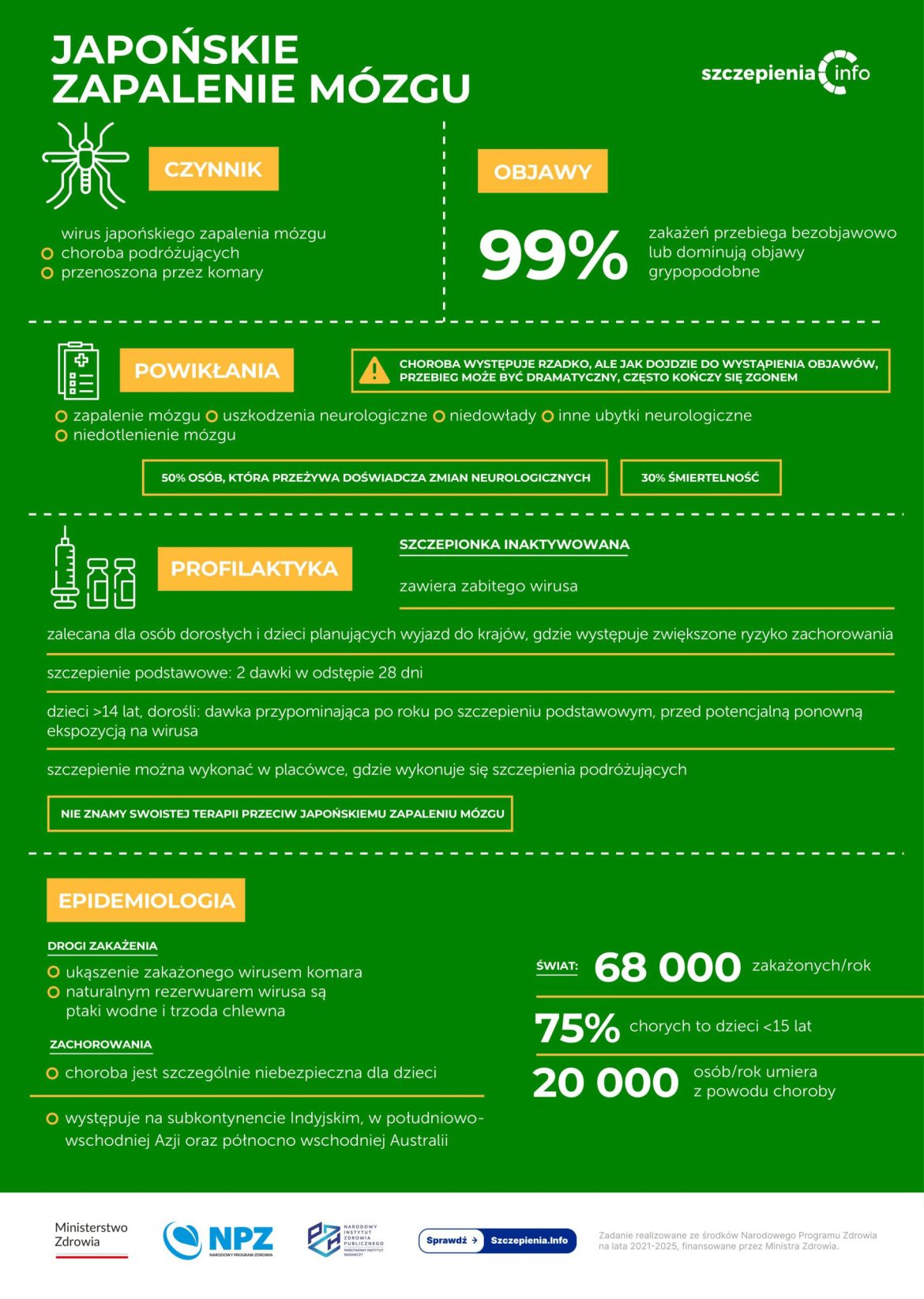 Japońskie zapalenie mózgu jest chorobą wirusową przenoszony przez komary. Naturalnym rezerwuarem wirusa są ptaki wodne i trzoda chlewna. Okres wylegania choroby wynosi od 6 do 16 dni. Większość zakażeń (99%) przebiega bezobjawowo lub dominują objawy grypopodobne. U około 1% zakażonych obserwuje się ciężkie objawy, tj. zapalenie mózgu, uszkodzenia neurologiczne, niedowłady oraz inne ubytki neurologiczne. Trwałych zmian neurologicznych doświadcza połowa osób, które przeżywają chorobę. Śmiertelność sięga nawet 30%. Główną przyczyną zgonu w przebiegu choroby jest niedotlenienie mózgu.