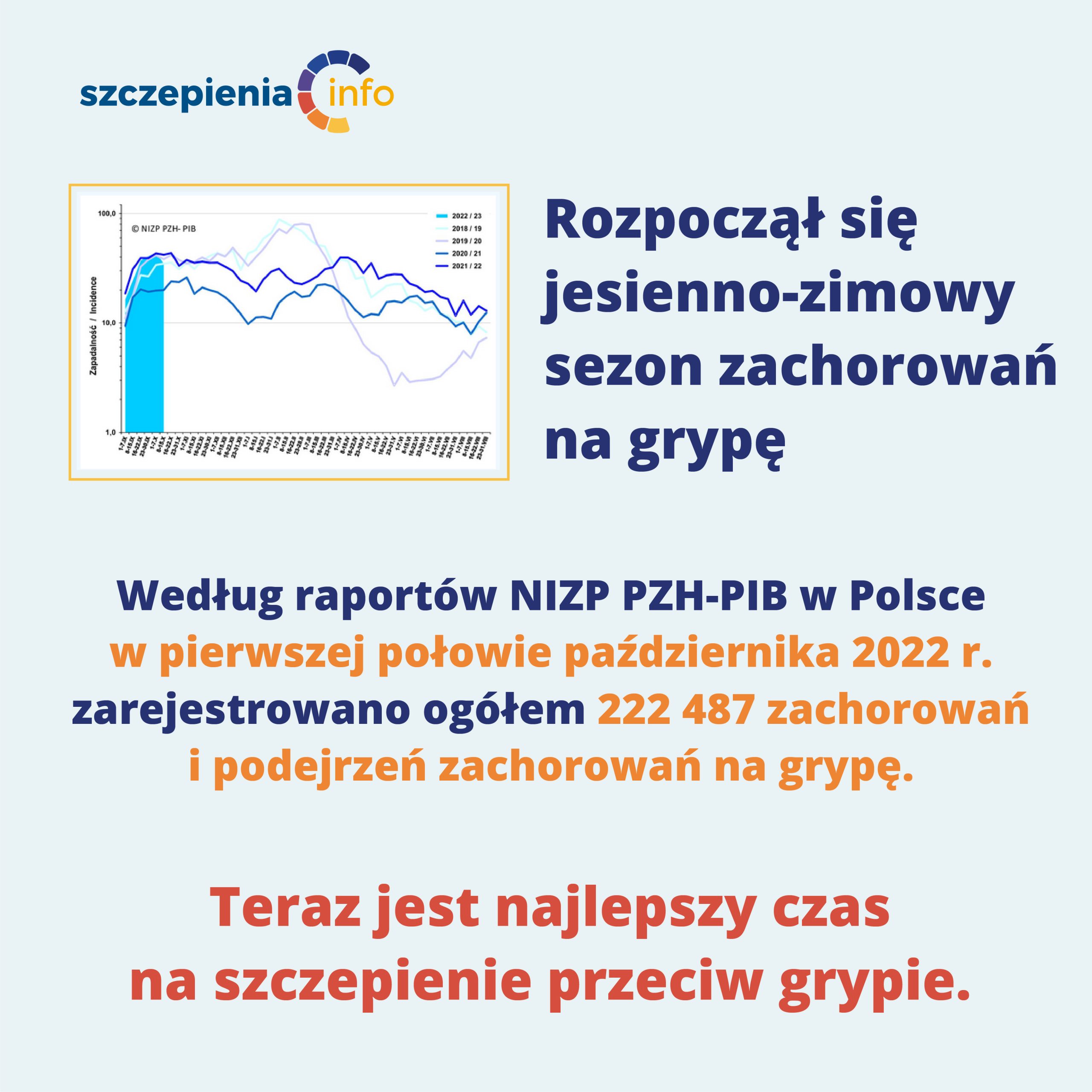 Rozpoczął się jesienno-zimowy sezon zachorowań na grypę. Według raportów NIZP PZH-PIB w Polsce w pierwszej połowie października zarejestrowano ogółem 222 487 zachorowań i podejrzeń zachorowań na grypę, w tym samym okresie 2021 r. – 244 275 zachorowań. Najlepszym sposobem ochrony przed grypą jest coroczne szczepienie.