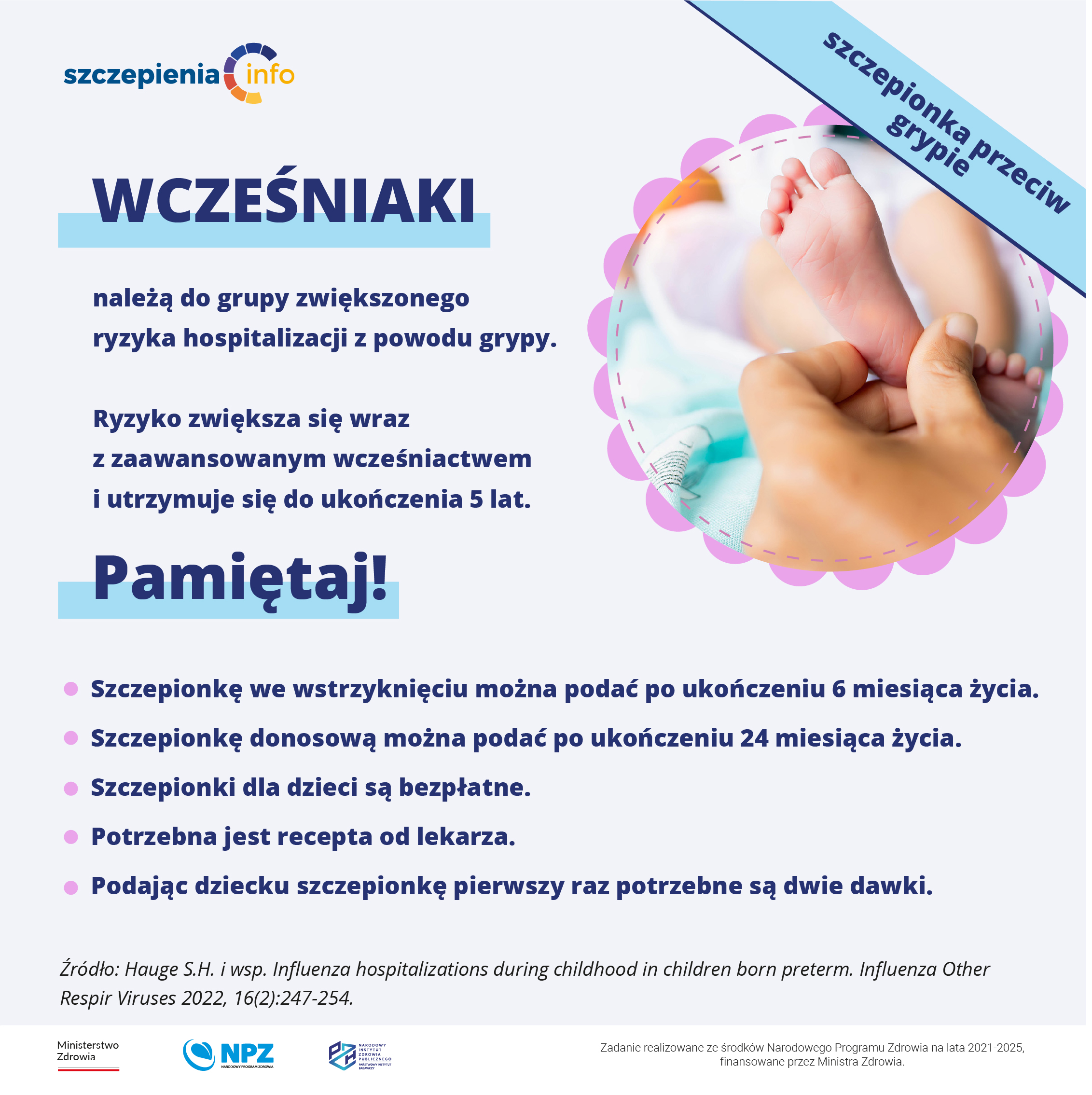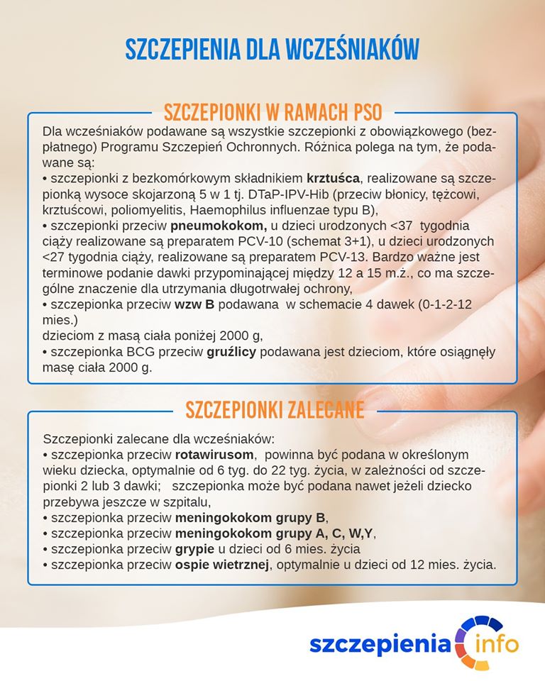 Co roku w Polsce rodzi się ok. 22 tys. noworodków urodzonych przedwcześnie (wcześniaków). Ponieważ wcześniaki są narażone na zwiększone ryzyko zakażeń i kolejnych hospitalizacji, szczepienia ochronne są dla nich wyjątkowo ważne. U wcześniaków notujemy wyższe ryzyko wystąpienia inwazyjnej choroby pneumokokowej, zachorowania na krztusiec, zachorowania na grypę oraz hospitalizacji z powodu biegunki rotawirusowej.