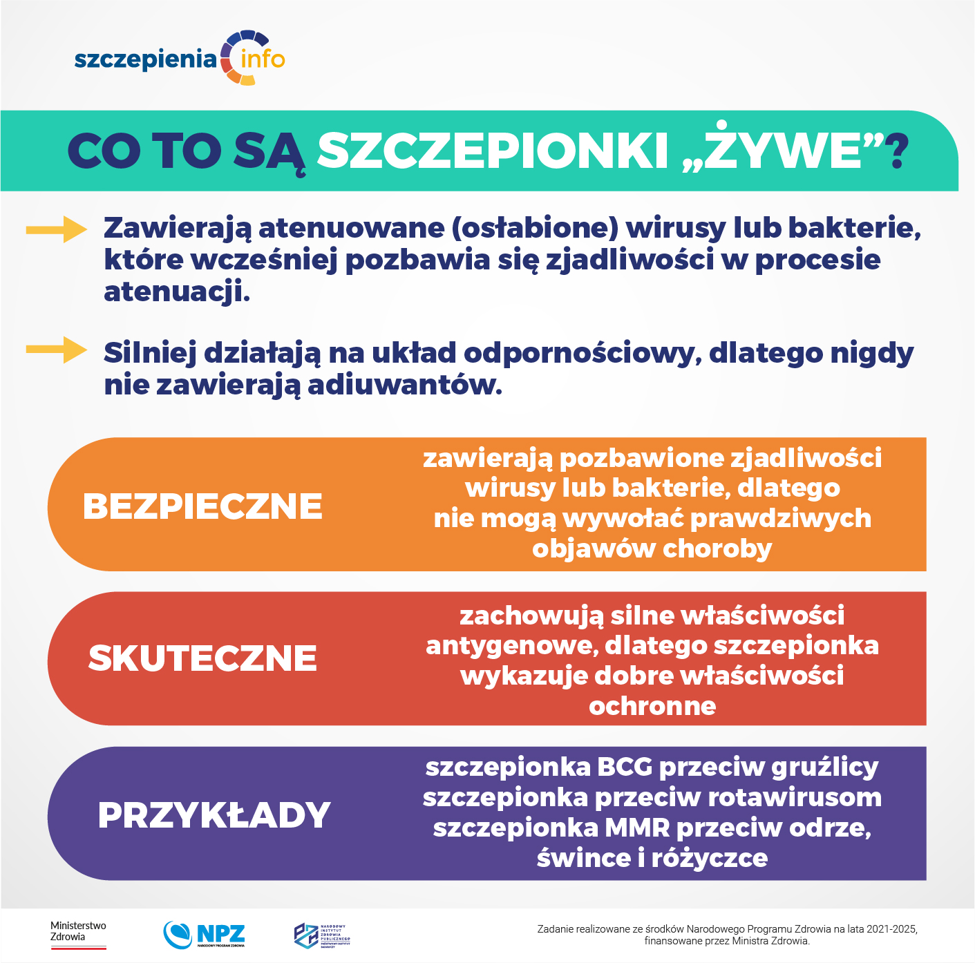 Szczepionki żywe zawierają atenuowane czyli osłabione wirusy lub bakterie. Silniej działają na układ odpornościowy, dlatego nigdy nie zawierają adiuwantów.