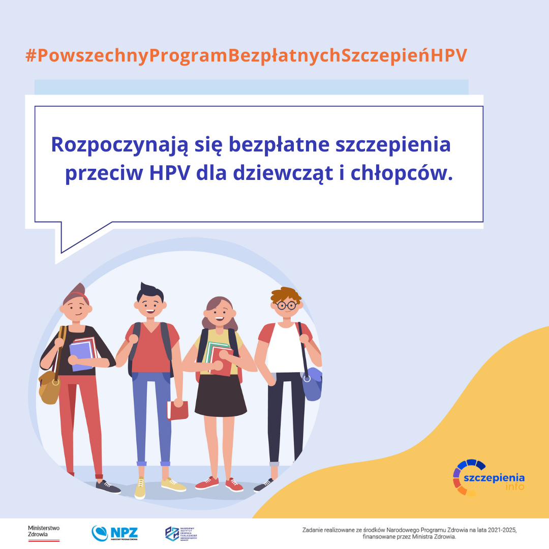 1 czerwca rozpoczyna się powszechny program szczepień przeciw HPV. Program realizuje założenia i cele Narodowej Strategii Onkologicznej na lata 2020-2030. Uzupełnia bezpłatny Program Szczepień Ochronnych dzieci i młodzieży o nowy zakres ochrony przed chorobami wywołanymi przez ludzki wirus brodawczaka (HPV). Minister Zdrowia wprowadzając szczepienie przeciw HPV rozszerza zakres ochrony przed rakiem szyjki macicy i innymi chorobami nowotworowymi związanymi z HPV. Minister Zdrowia bazuje na światowych i europejskich rekomendacjach podkreślających bezpieczeństwo, skuteczność i korzyści wynikające z realizacji programów szczepień przeciw HPV. Dotychczasowe wyniki badań wskazują jednoznacznie, że głównym celem szczepienia przeciw HPV jest zapobieganie chorobom nowotworowym.